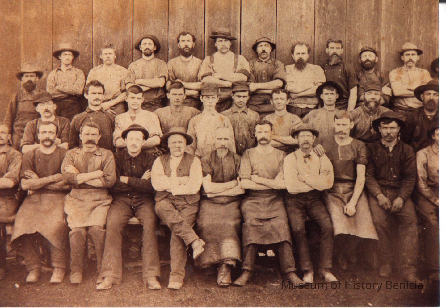slightly sepia toned photograph: three rows of male tannery workers standing and sitting outside the building