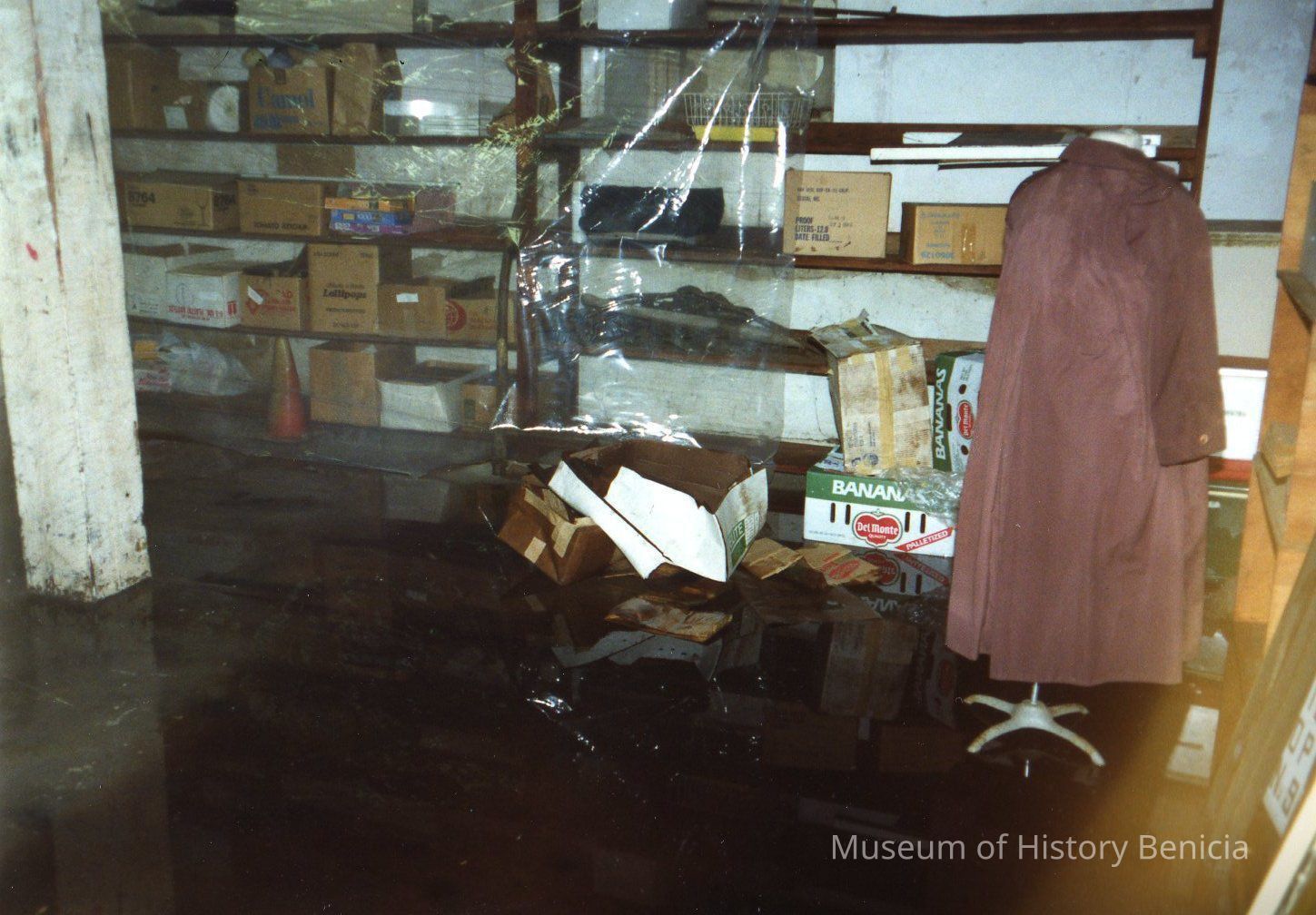 Museum flooding--Building 7 when contractor took east side of roof off the day before the storm. Color photo flooded floor