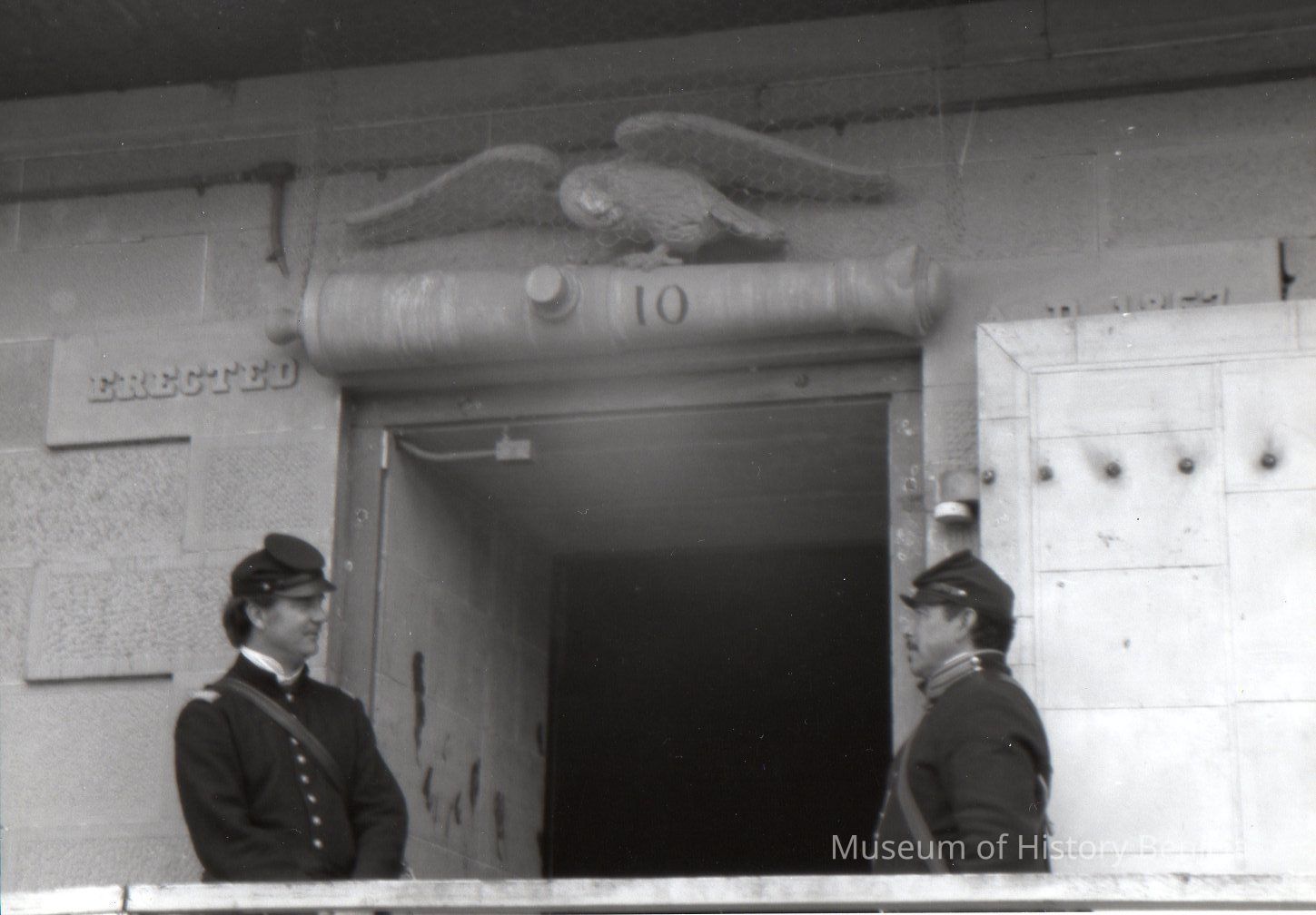 B/W photo of David Stevens and another unidentified re-enactor standing on either side of the powder magazine doorway (building 10)Collection