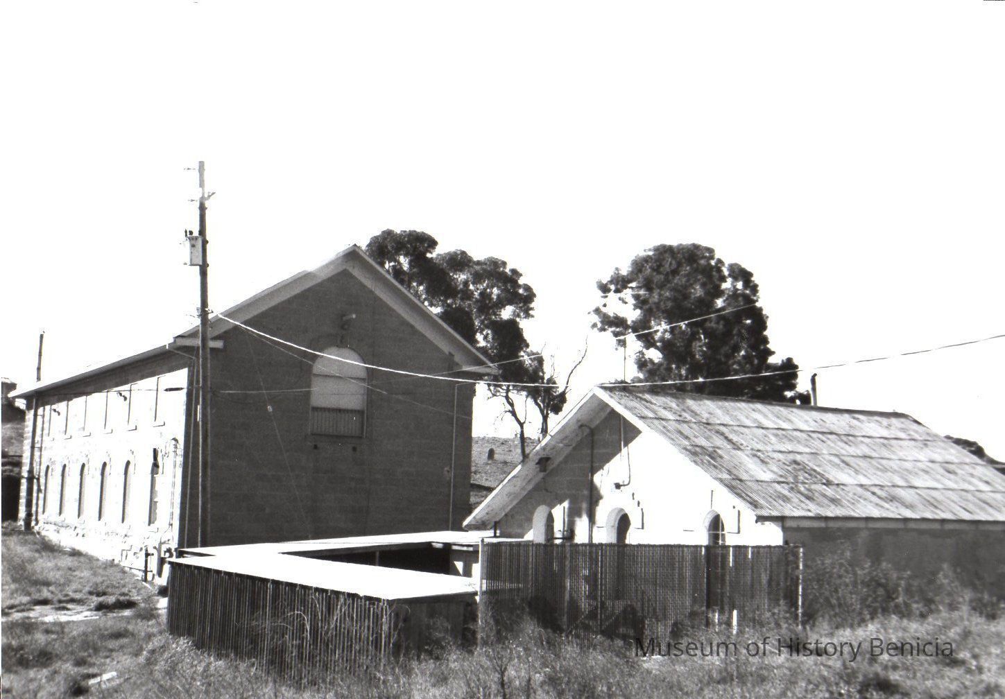 B/W photo of Museum rehabilitation. Buildings #8 and #9 from the rear matches negative BHM98.99.55