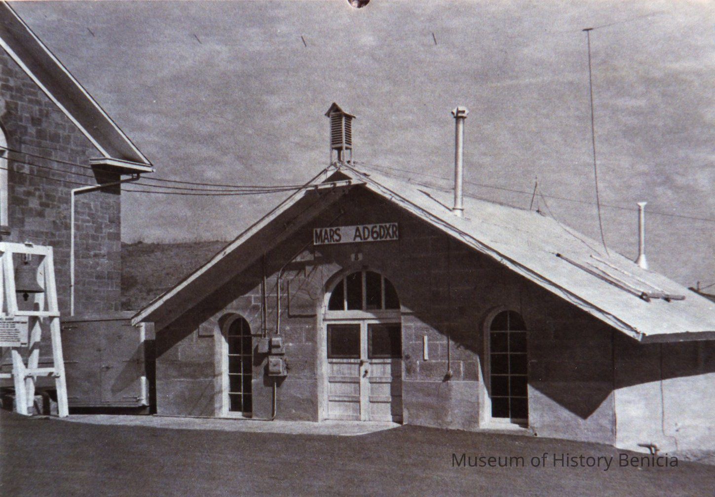 B/W Photo taken from Benicia Arsenal Manual. Building #8 - Engine House or ammunition shop as per 1961. Stone with corregated roof. 28'x35', area 832 sq. ft. One story, has a skylight of glass of more recent vintage. A cistern full of water is below the floor. (per label on back of photo) The MARS on the front of the building stood for Military Afilliate Radio Station.Collection