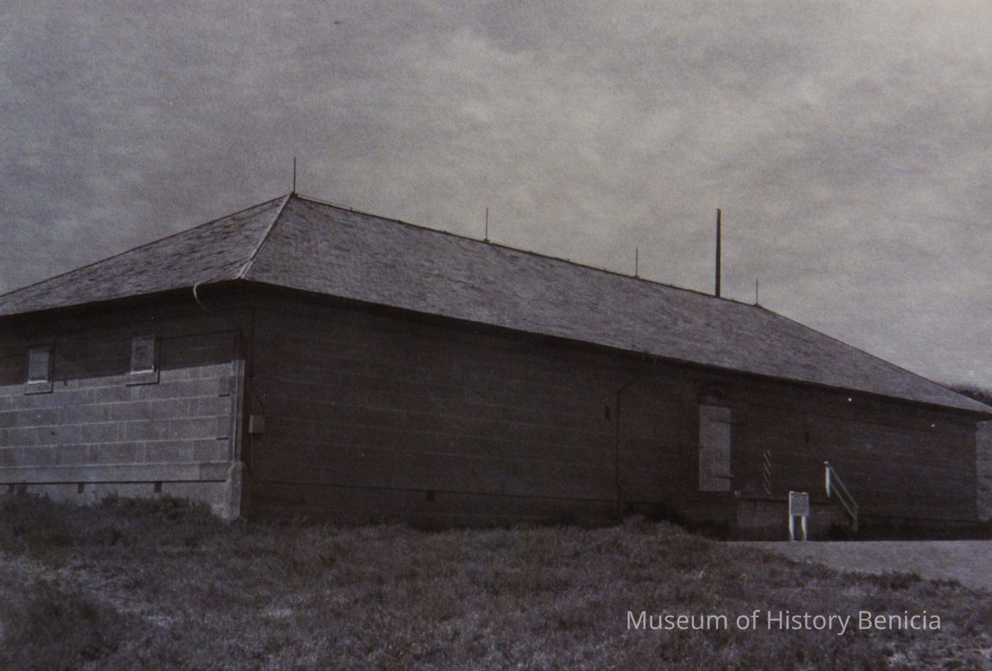 B/W Photo taken from Benicia Arsenal Manual. Building #10 - magazine 1857 cost $35,262. stone with slate roof. interior has carved stone columns, wood floors and wood wall coverings. area - 3,000 sq. ft. dimmensions - 35.5'x104' - 7".