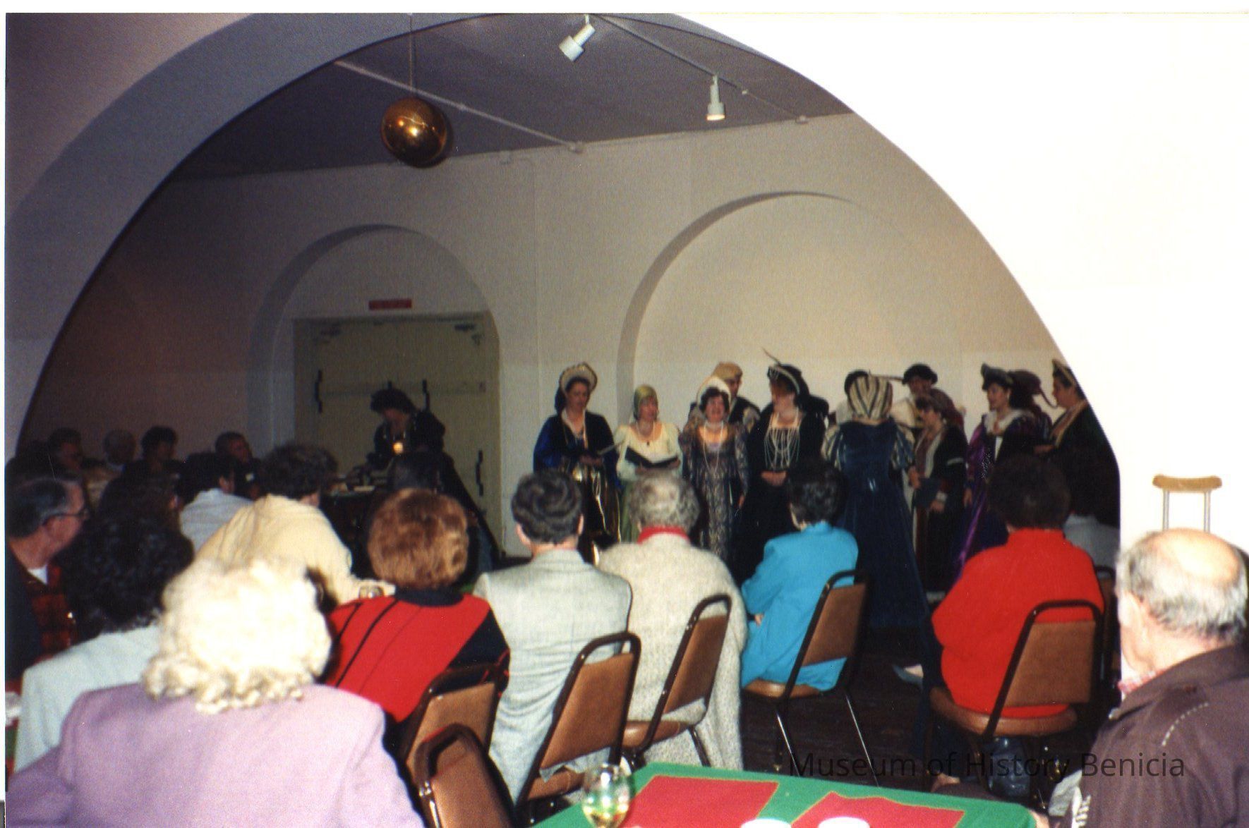 Color photo of the audience watching singers in Renaissance Dress at the Camel Barn Christmas party 1991.
