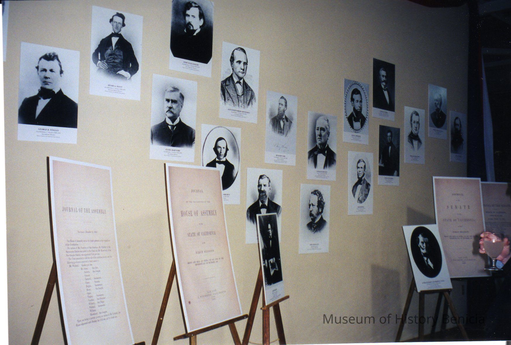 Color photograph: Sesquicentennial Celebration of California Commemorative Session Luncheon at the Clock Tower. Photos of former legislators are displayed.Collection