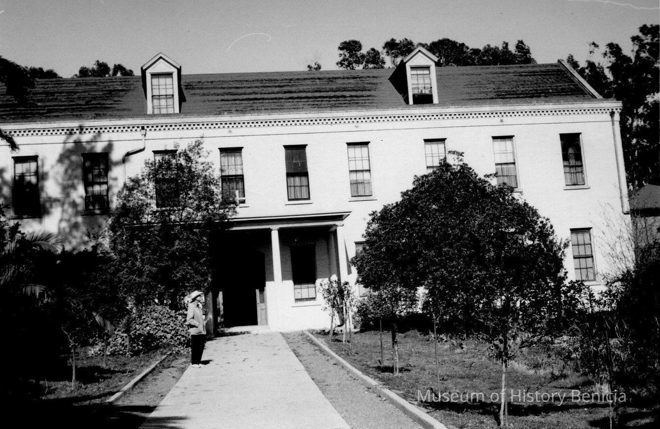 B/W photograph of the main building of the nun's residence at St. Catherine's Academy. The photograph was taken just before demolition of the Academy. A person stands on the sidewalk leading to the front door.Collection