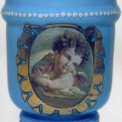 This is a duplicate of BHM01.6.2. Porcelain urn, hand-painted blue with a painted picture of an angel looking up; color photo shows urn at actual size.
