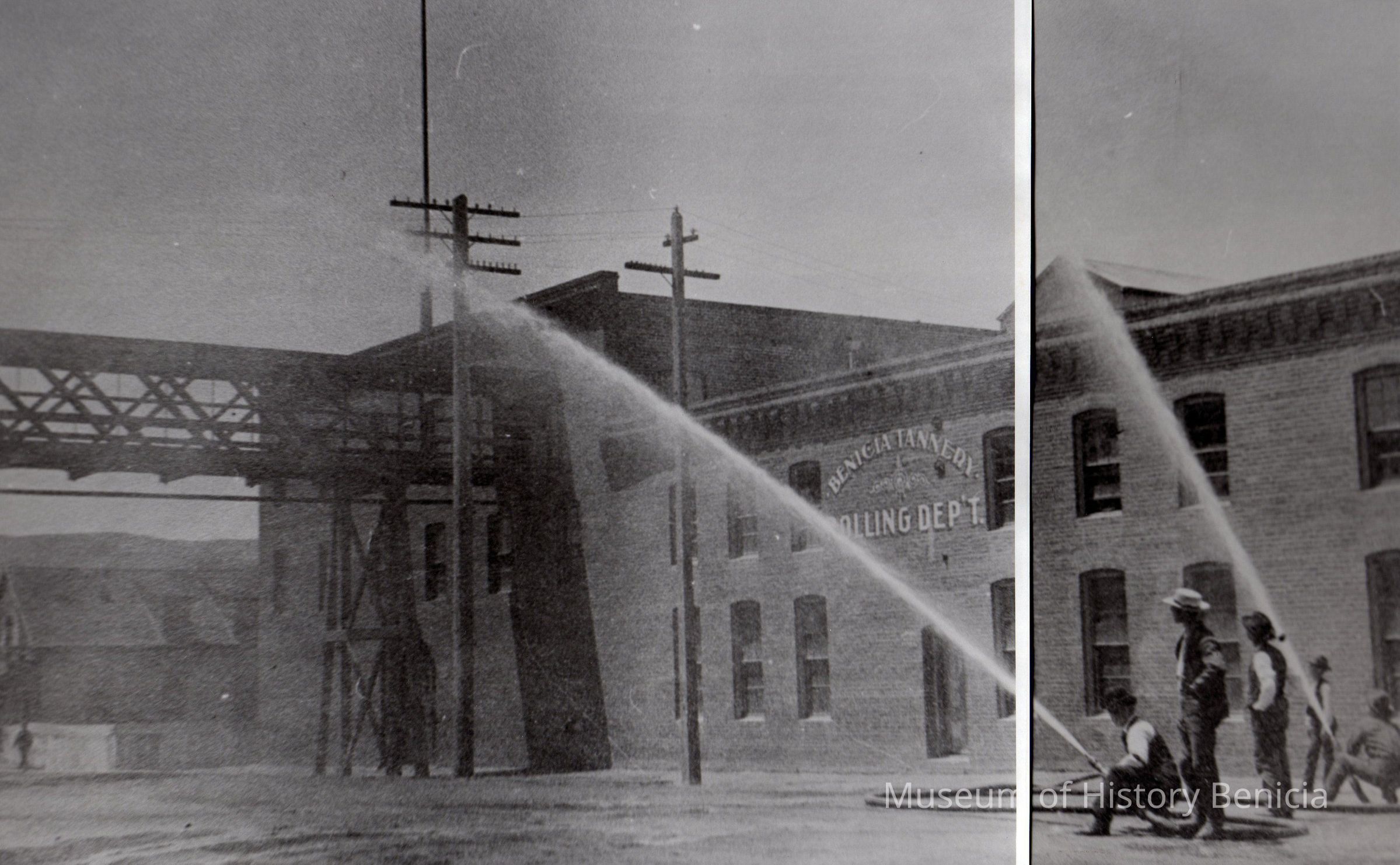 B/W photo of some of the Kullman Salz Tannery buildings on First Street, with five men at right foreground using firehoses (apparently for some kind of fire practice). When aligned with BHM01.9.21a and overlapped, one scene is formed.Collection