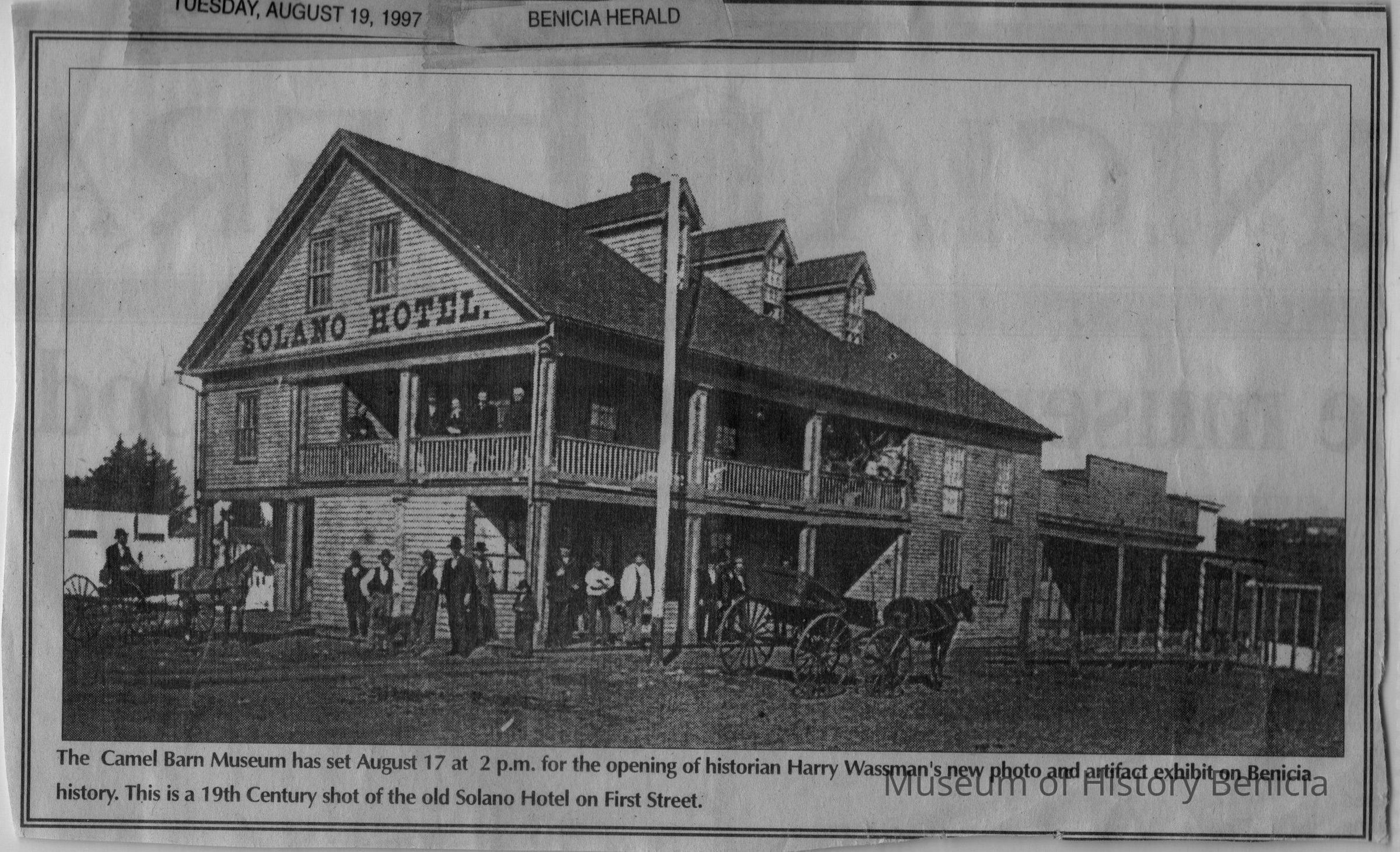 The caption reads: The Camel Barn Museum has set August 17 at 2 p.m. for the opening of historian Harry Wassman's new photo and artifact exhibit on Benicia history. This is a 19th Century shot of the old Solano Hotel on First Street.Collection