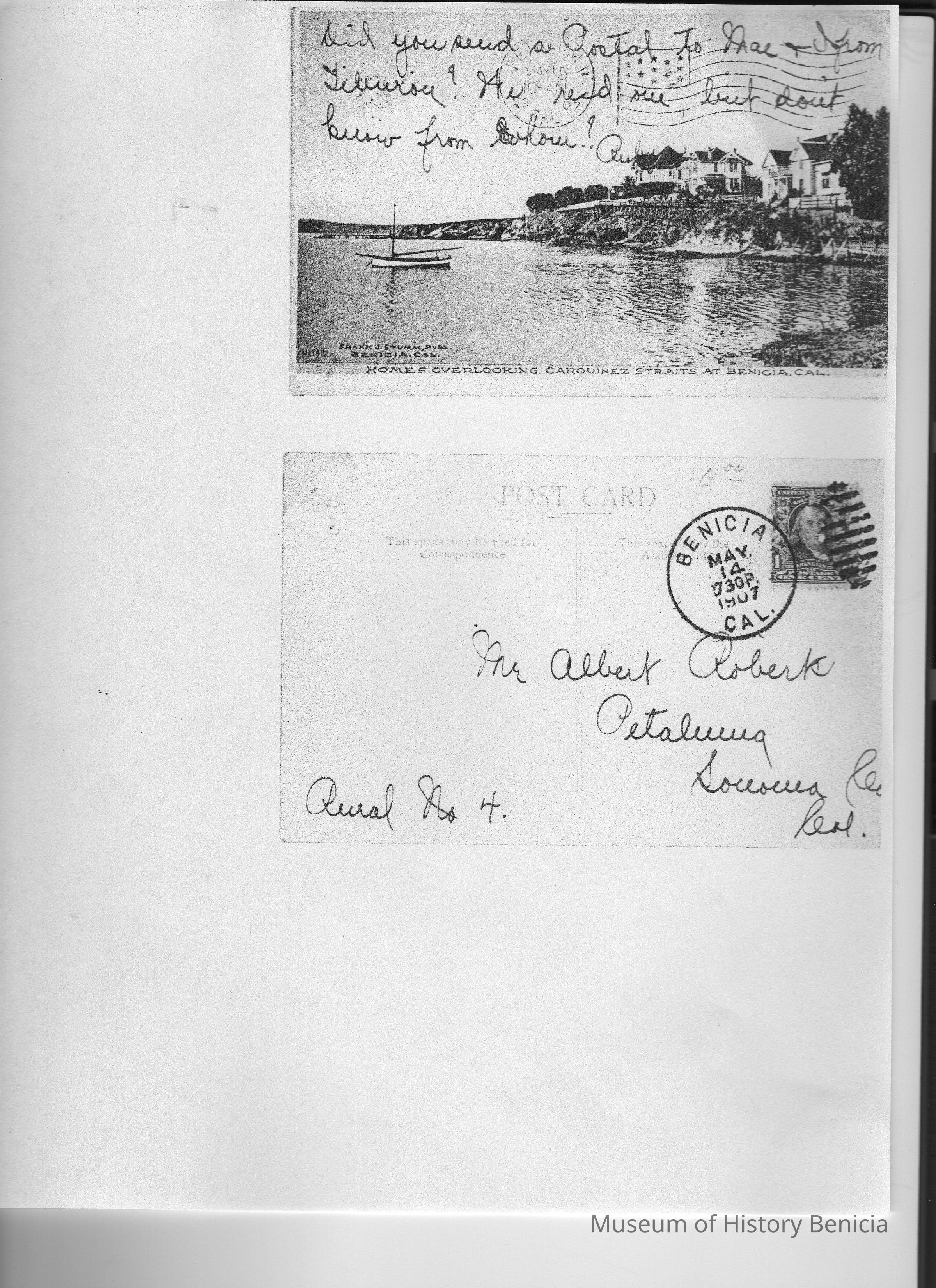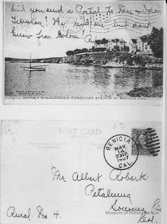 Photocopy ot the front and back of Stumm postcard showing "Homes Overlooking Carquinez Straits at Benicia Cal". handwriting on upper front reads "Did you send a Postal to Mae & I from Tiburon? We rec'd one, but don't know from whom" and unreadable signature (might be "Ruby").