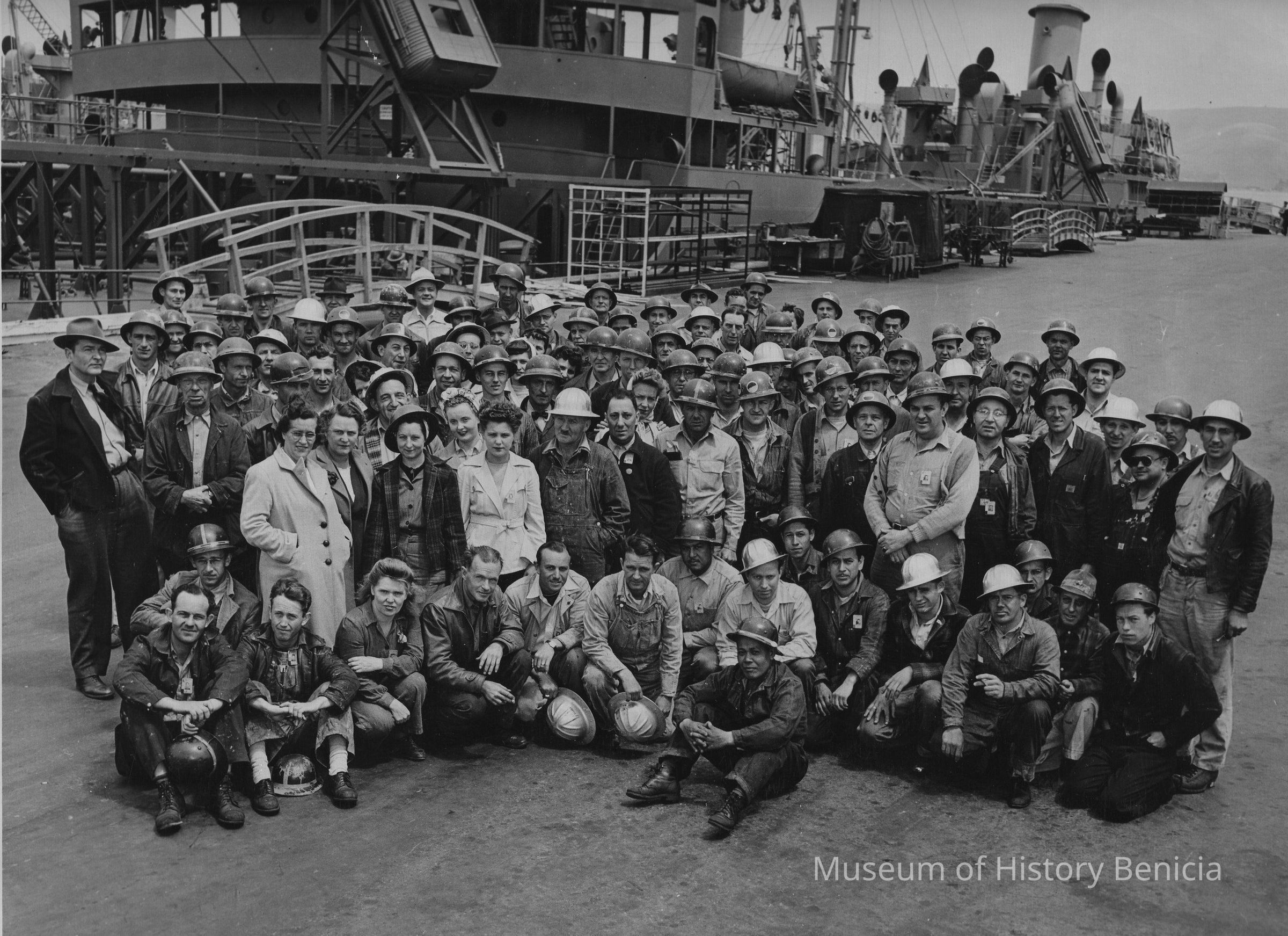 B/W photograph of a large group of men and women on a dock with a ship in the background. Most of the people are wearing or holding hard hats. Twenty names are written in different handwriting on the back. They could be individuals in the photograph but it is not indicated where they are in the photograph.Collection