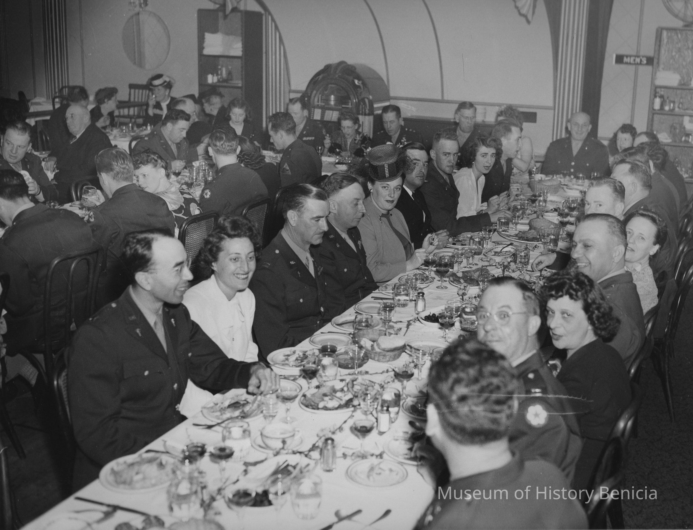 B/W photograph of a dinner/luncheon for men and their wives. Many of the men are wearing officer's uniforms. The occasion of the event is unknownCollection