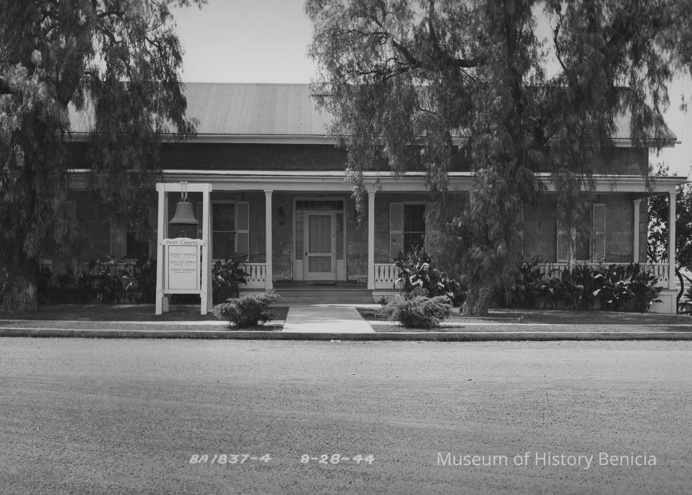 B/W photograph of original Post Hospital. Written on the bottom of the front is BA1837-4 8-28-44