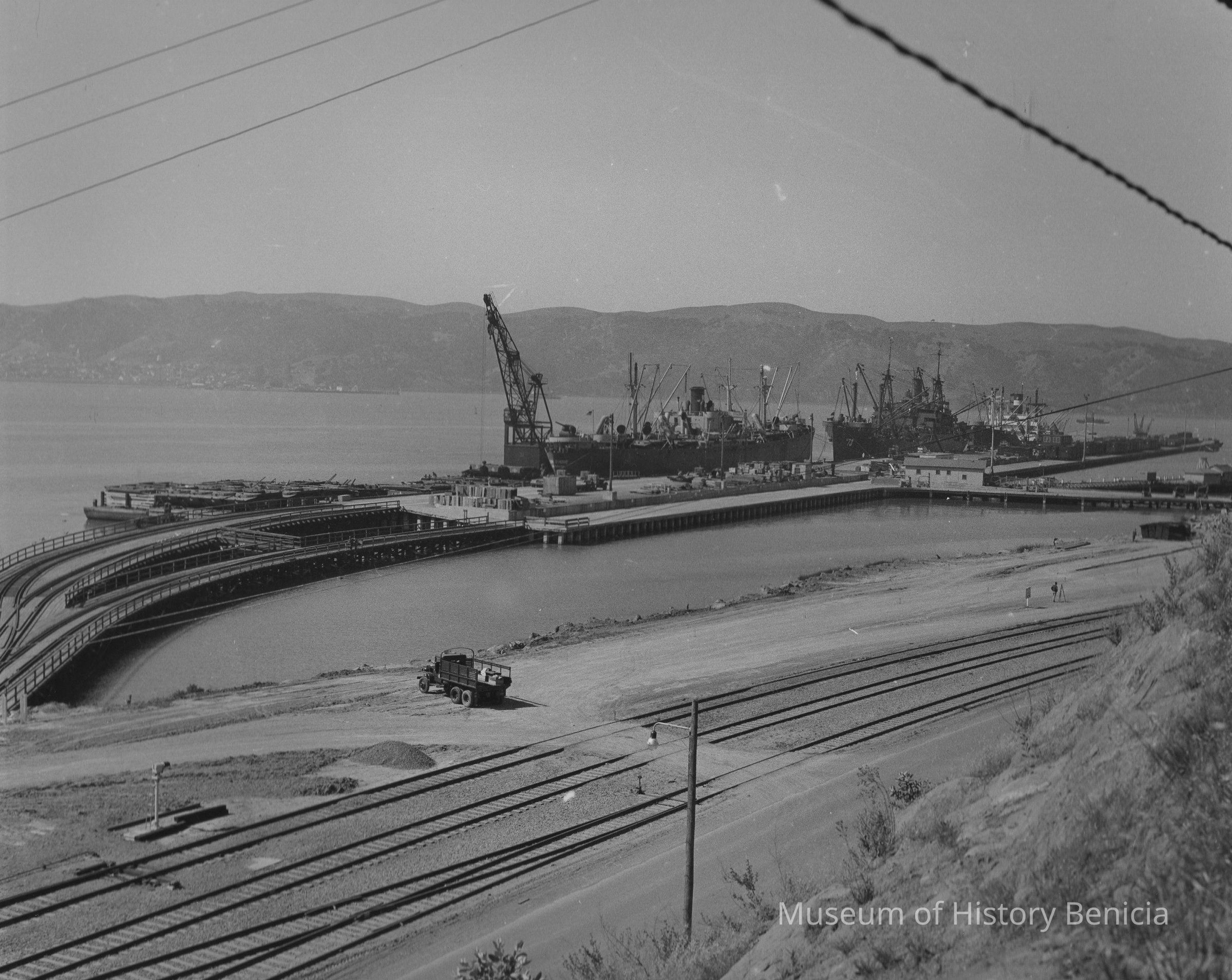 B/W photograph of tanks and other equipment being locaded on ships at the Arsenal Dock. A large crane is next to a ship named the William D. Hoxie, Savannah GA. Two other smaller ships are also moored along side the pier. "E. Peltier" is written on the back in blue ink.Collection