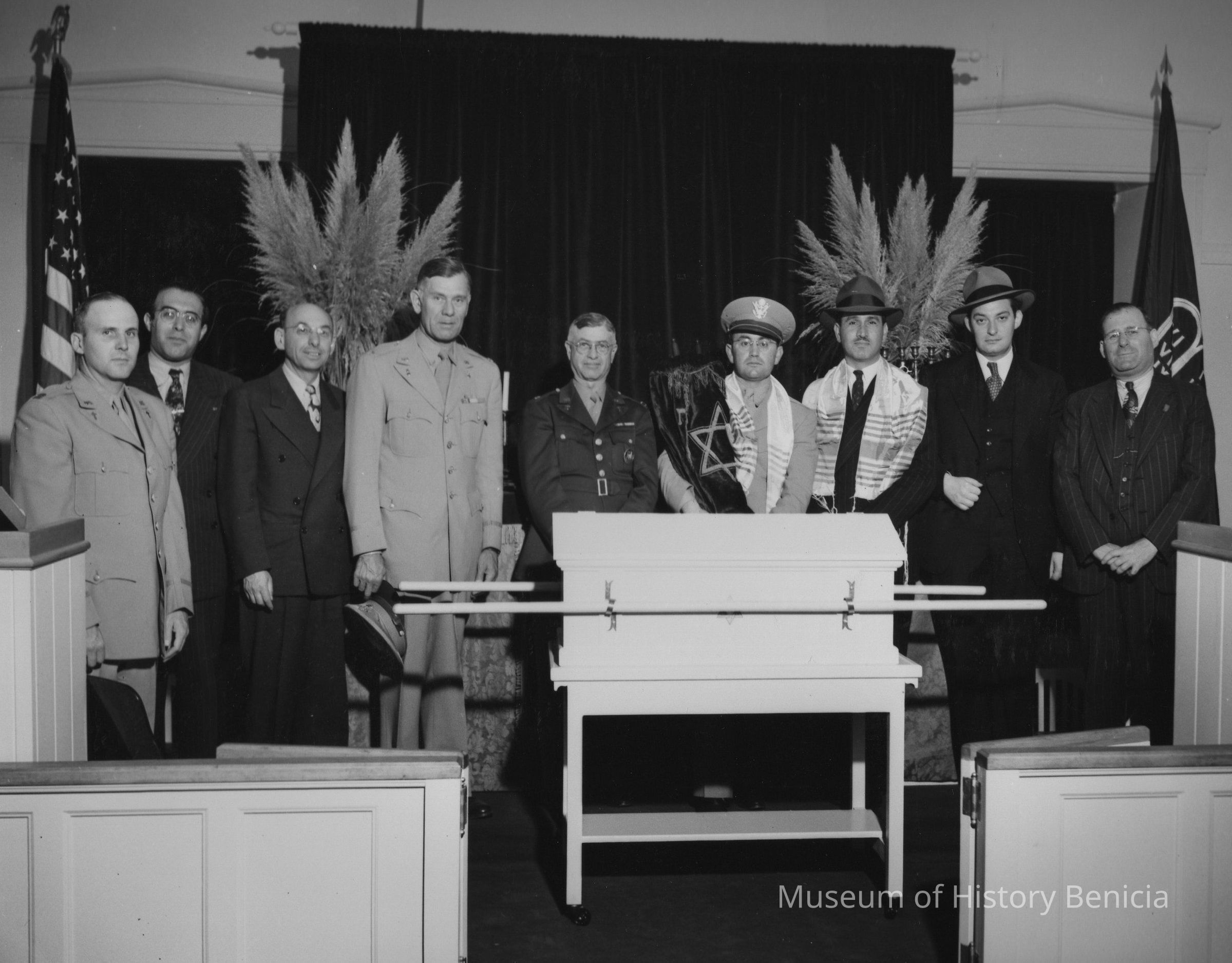 B/W photograph of nine men (unidentified) taken in the Post Chapel. The sixth man from the left is a chaplin in his Jewish regalia.