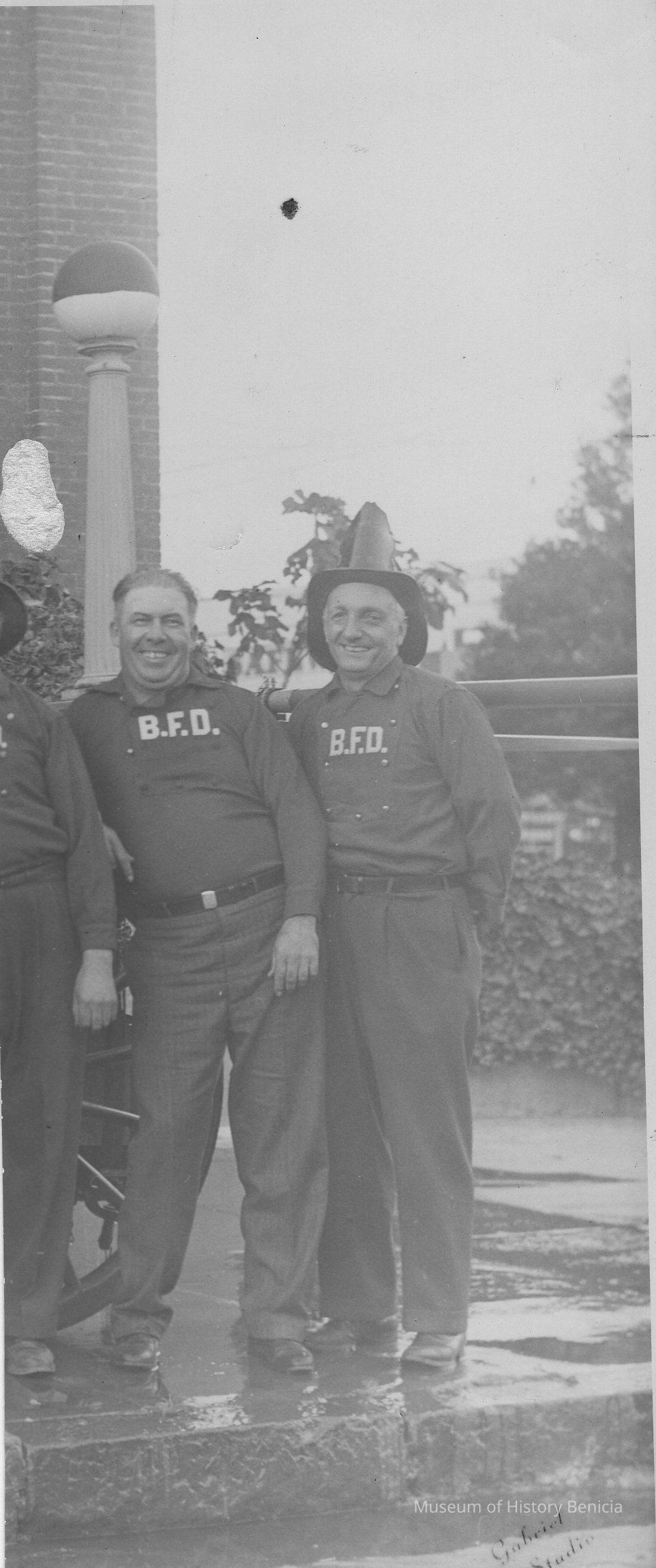 B/W partial photograph (narrow section cut from a larger one) of two firemen; Steve DeBenedetti is on the right