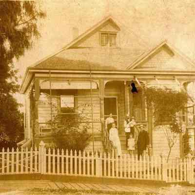 Large photo of a family on the porch of their house.