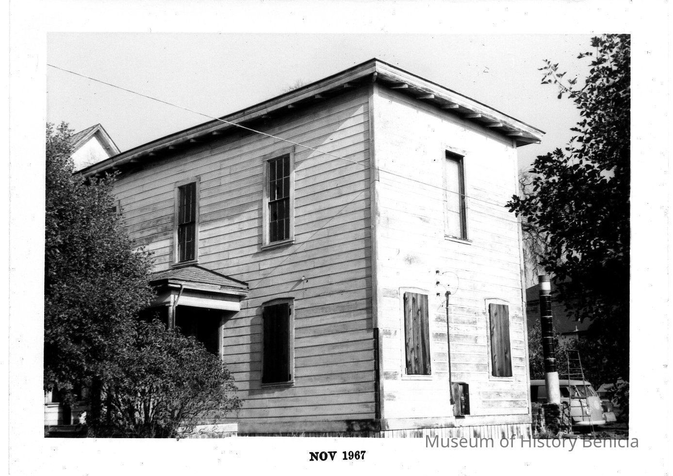 B/W photograph: original building of St. Augustine College relocated to a little south of the South East corner of West Second and West J Streets at the rear of the old Methodist Church (later to become an antique shop and currently, 2007, a day spa and hair salon.Collection