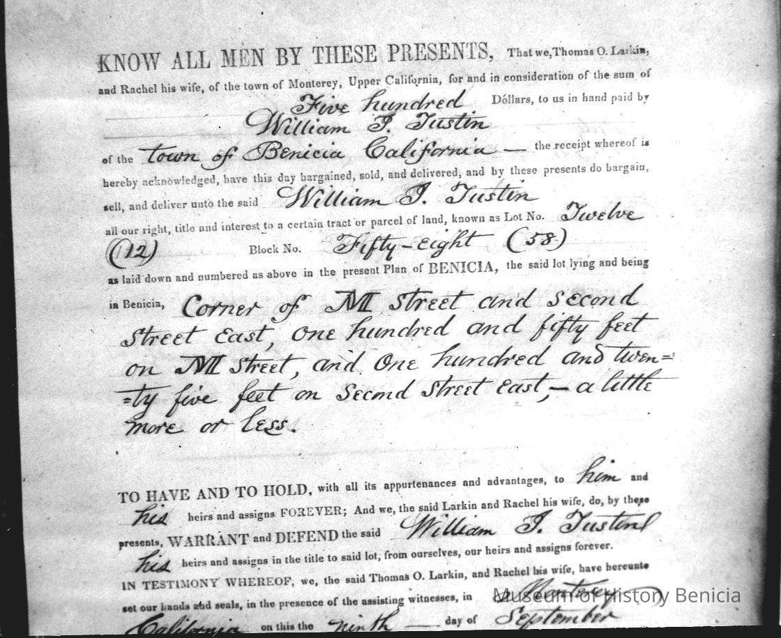 B/W photograph: show part of a photostatic copy of the first deed in Benicia, that of William Tustin, who built the first house in Benicia, an adobe structure, on the corner of M Street and second street east; "one hundred and fifty feet on M street, and one hundred and twenty five feet on second street east, - a little more or less."Collection