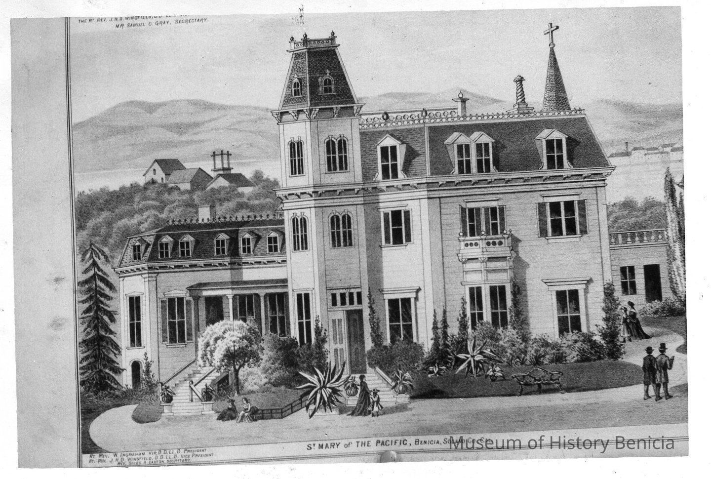 B/W photograph of a photograph of a lithograph of St. Mary of the Pacific, Benicia, Solano County, Cal.