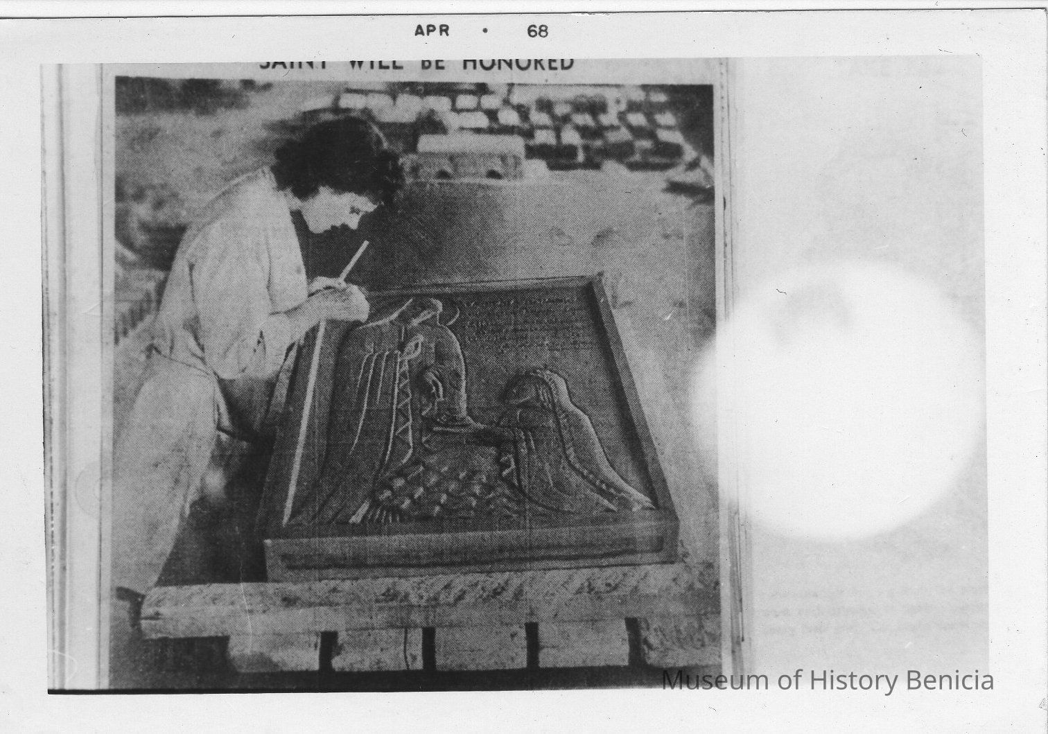B/W photograph: photograph of a photograph: Lula Braghetta, artist of terra cotta plaque 1939; plaque was made in honor of Conception ArguelloCollection