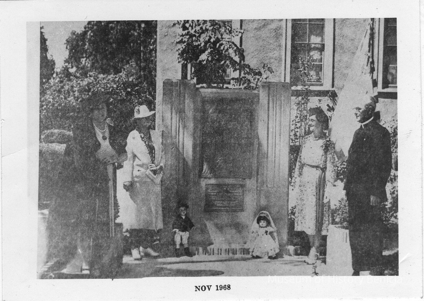 B/W photograph: photograph of a photograph: shows four individuals standing by the Conception Arguello monument in the St. Catherine's garden (now at St. Dominic's cemetery). L-R: Mrs. D'Arcy Parker, Mrs. W.L. Warburton, Mrs Orinda G. Giannini, and Rev. Father Clyne. Mrs. Parker and Mrs. Warburton are great-grand nieces of Conception. Mrs. Giannini was president of Native Daughter of Golden West in 1939. There are also two dolls perhaps representing Conception Arguello and her Russian Prince. This is the dedication day of the monument.Collection