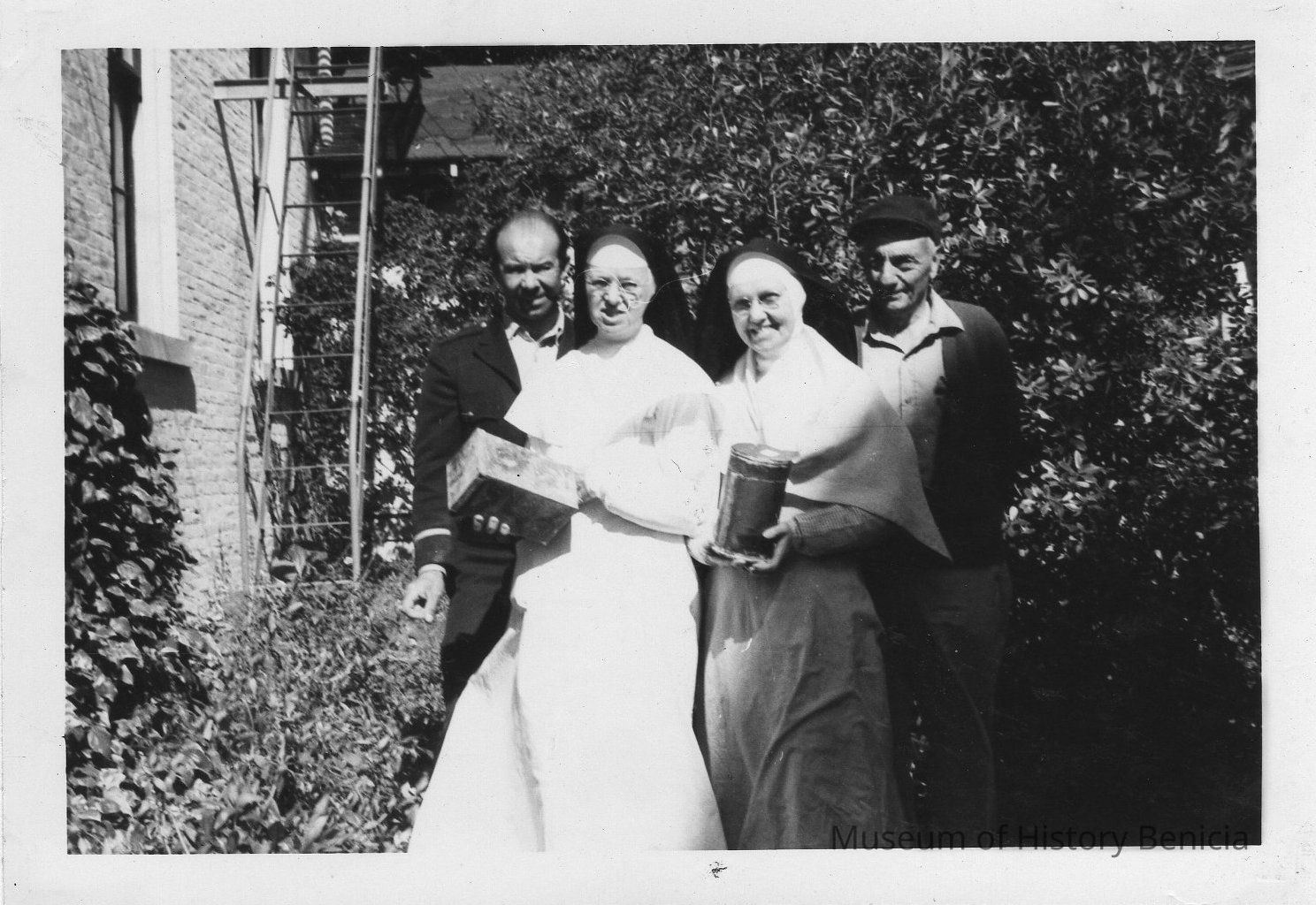 B/W photograph: four individuals in the garden at St. Catherine's, left to right: Walter Gieffels, Fire Chief; two Dominican Sisters; and Steve DeBenedetti. The nuns are holding boxes from the corner stones which were removed by the two men. The Convent was built in 1859 and demolished in April 1966.
