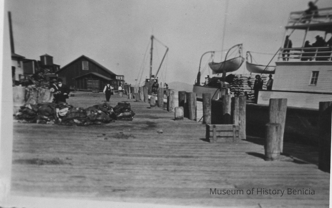 B/W photograph of a photograph : the caption from the album reads: "Either the Steamer Apache or Modoc, S.P., just docking at Condare's wharf". Later Southern Pacific steamer wharf. It was located to the left of the old cannery dock as you look from the water. Note the hides for Benicia Tanneries.Collection