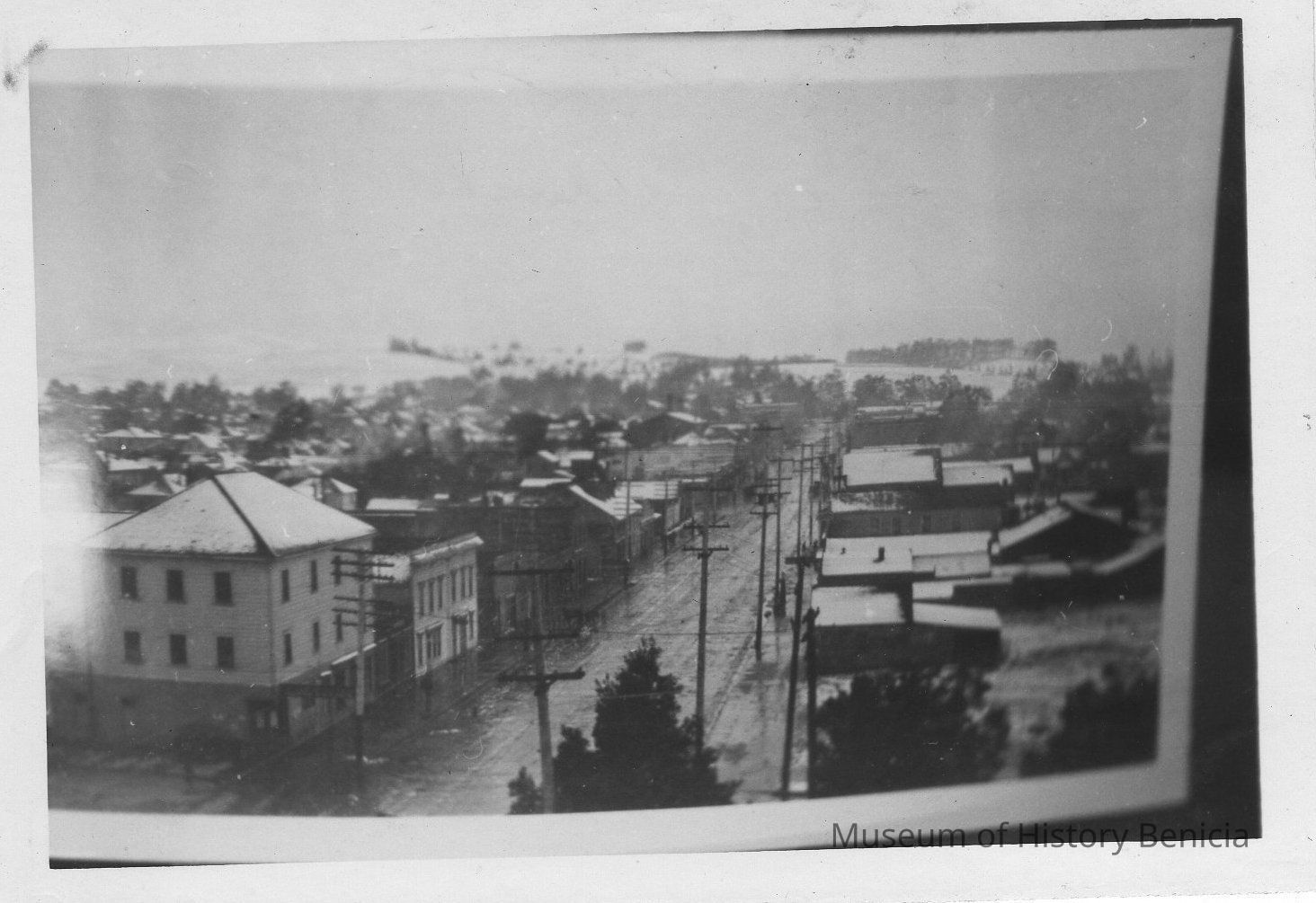 B/W photograph of a photograph: on the back of the photograph is written "snow scene in Benicia, could be in 1921." The scene is on First Street looking North.Collection