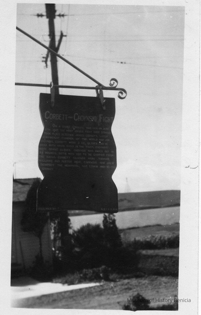 B/W photograph: per back of photograph: "This is the Corbett and Choynski marker. This type of markers are placed throughout the city's historical landmarks by the Native Sons - This marker tells about the fight between Corbett and Choynski held on a barge in South Hampton Bay in 1887."Collection