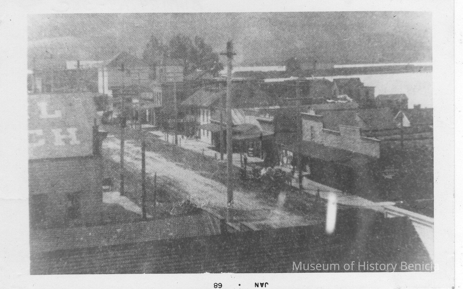 B/W photograph of a photograph: per album caption: an old picture of lower 1st street, at F St. showing portion of Lynch drawage and warehouse, formally Foley's Livery Stables. Gall's butcher shop, Solano Hotel and Union Hotel.Collection