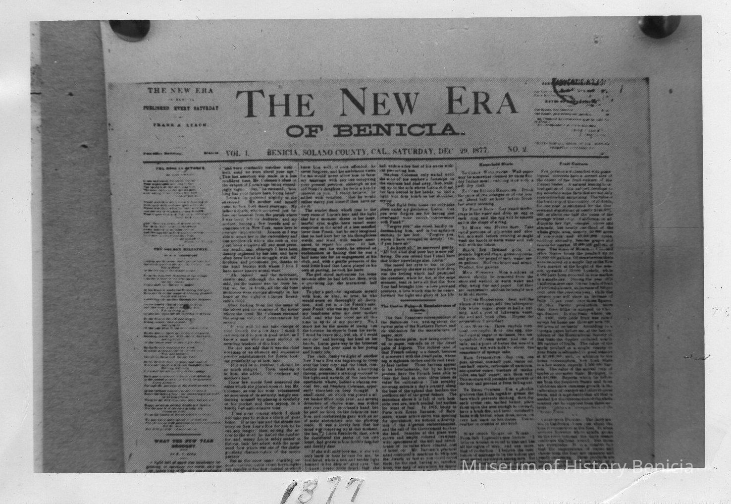 B/W photograph of a photograph (note thumb tacks): newspaper, The New Era of Benicia, 1877, reprinted in 1958