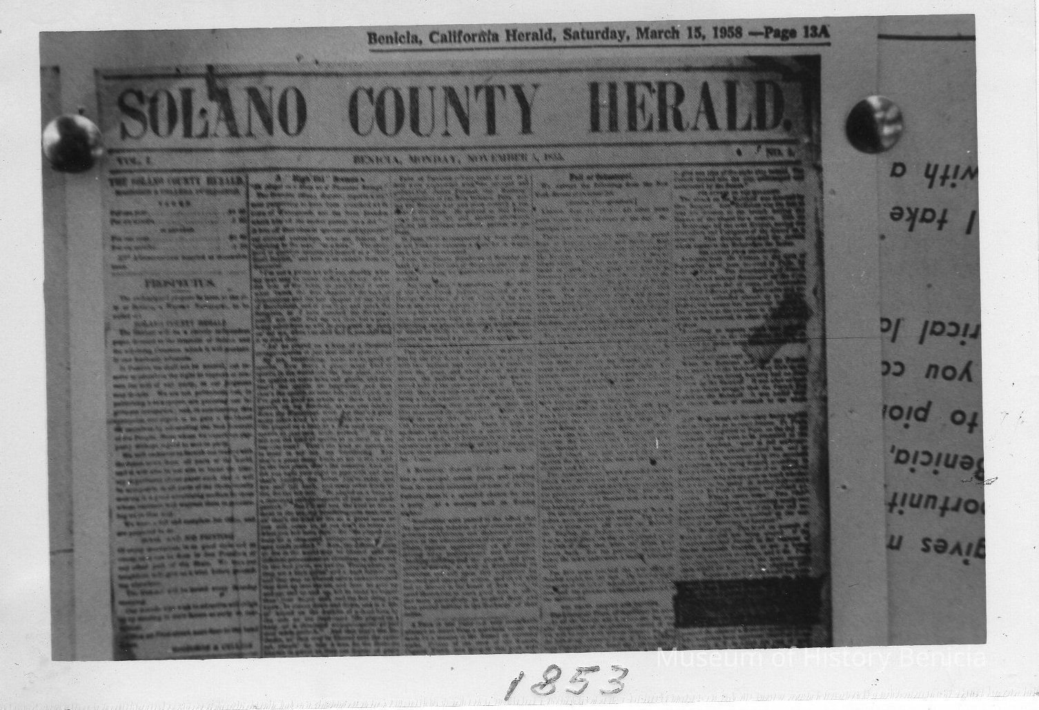 B/W photograph of a photograph (note thumb tacks): newspaper, Solano County Herald 1853, reprinted in March 1958