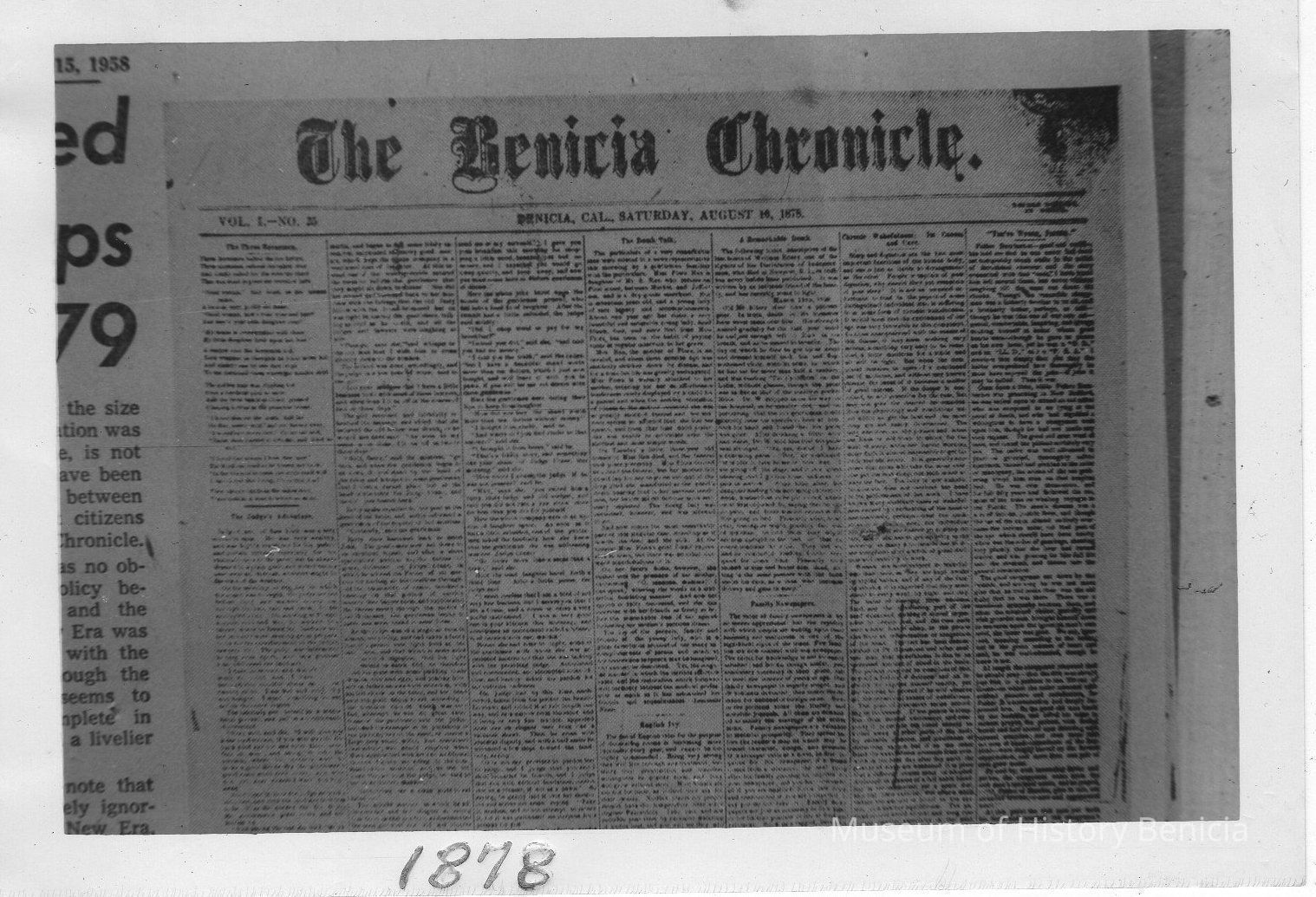 B/W photograph of a photograph (note thumb tacks): newspaper, The Benicia Chronicle, 1878, reprinted in 1958