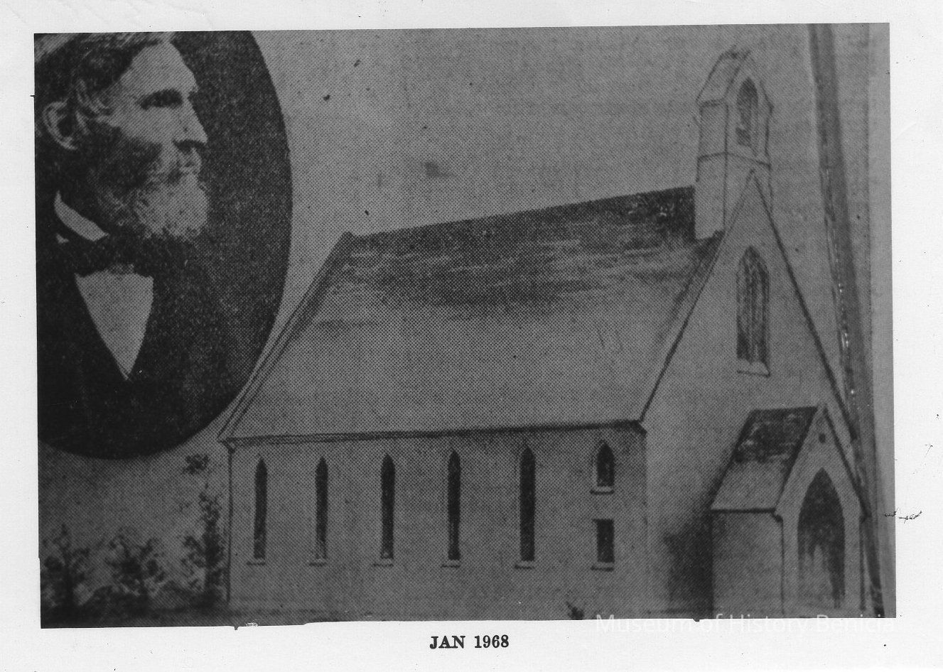 B/W photograph of a photograph: shows the first Protestant church in California built in 1850; oval inset in upper left corner shows Rev. Woodbridge. The building was also used as the First Public School in California.Collection