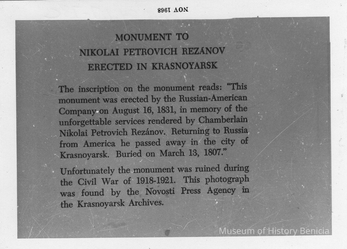B/W photograph of a photograph: inscription on Nikolai Rezanov's Tombstone "Monument to Nikolai Petrovich Rezanov erected in Krasnoyarsk"