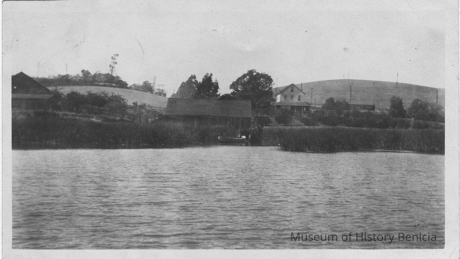 B/W photograph: shows Patrick Dillon house at Dillon Point from the water looking toward the house.