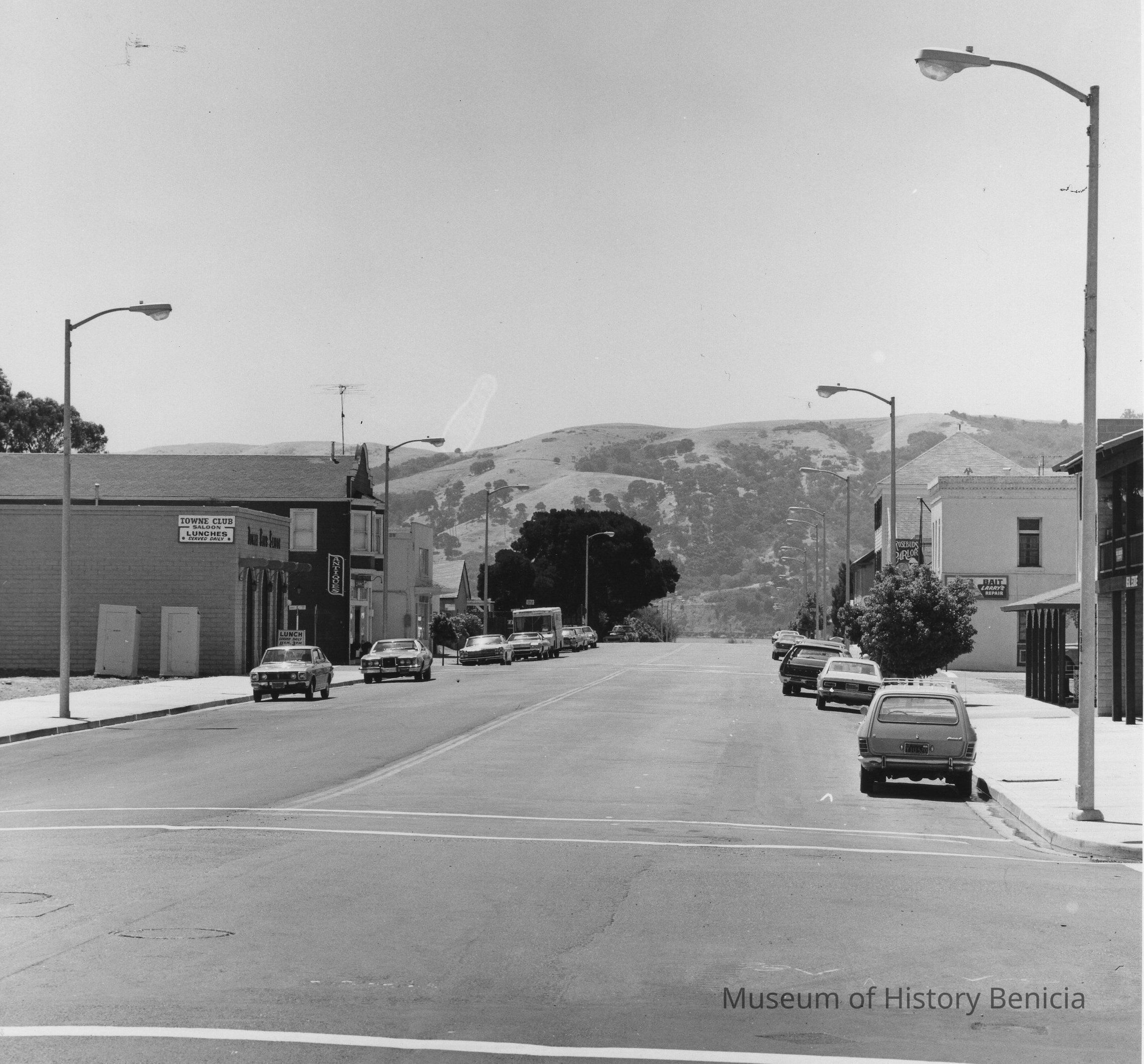 B/W photograph: per back of photograph: Looking down First Street toward the bay. The high roofed bldg on the right is the early day Union Hotel (location), the bldg. with the bait sign on was the French Laundry in former years, the bldg. on the left beyond the Towne Club is also one of Benicia's early bldgs.