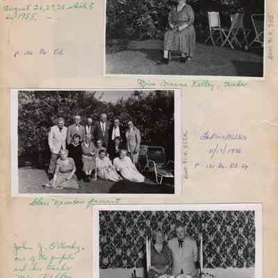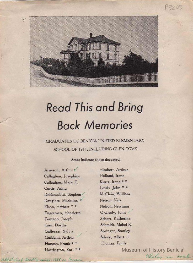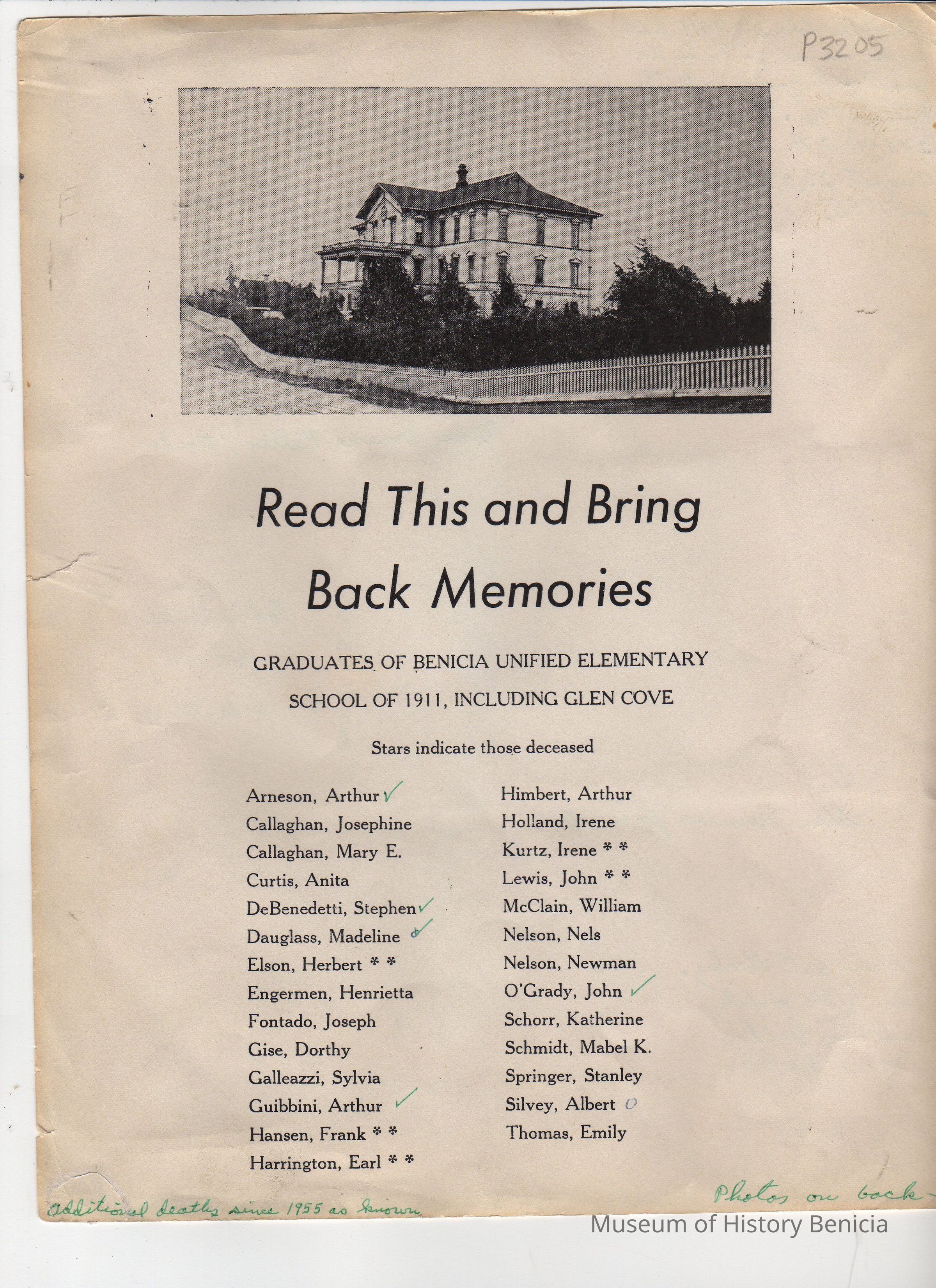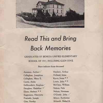 The photograph is glued to the back of the announcement for the Reunion which shows a picture of the Elementary (Grammar) School as it looked in the early 1900's above the words "Read This and Bring Back Memories" followed by "Graduates of Benicia Unified Elementary School of 1911, including Glen Cove" Then there is a list of the names of the 27 graduates with double asterisks next to those who were already deceased in 1955 when the Reunion was held. [Mrs. Miller wrote in green ink at the bottom that check marks indicated additional deaths since 1955 as known but the date she wrote that is not indicated]Collection