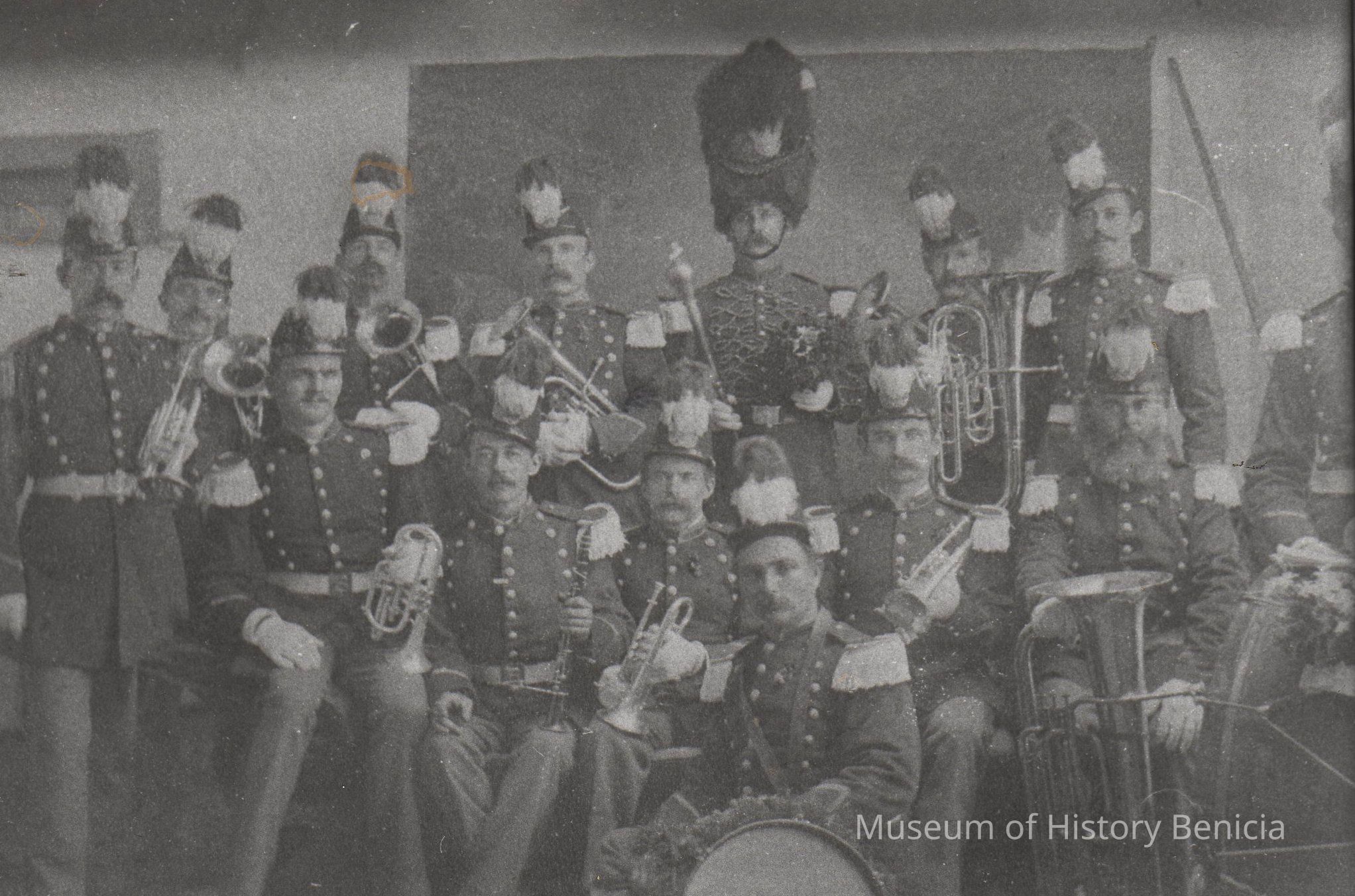 B/W partial contact print of a B/W Photograph: Band - July 4, 1888 - L to R back row: W. Starr, Albert Myers, George Godley, Nicholas Starr, Christine ______ (drum major in tall hat), William. Beck, George Connors, Martin Weir; L to R Front Row: Jack Kennidey, Jack Hefferman, Joseph Hearn, H. Starkey, James Smith, W. Shaw.