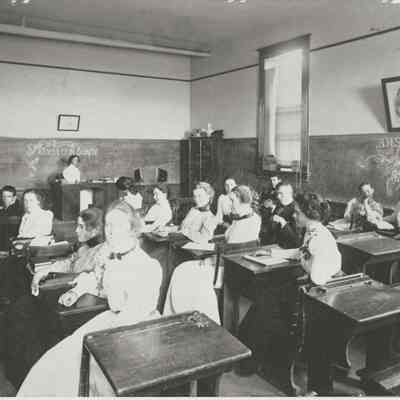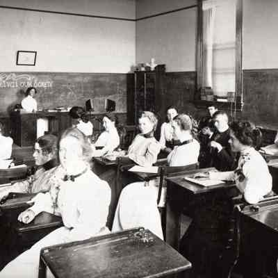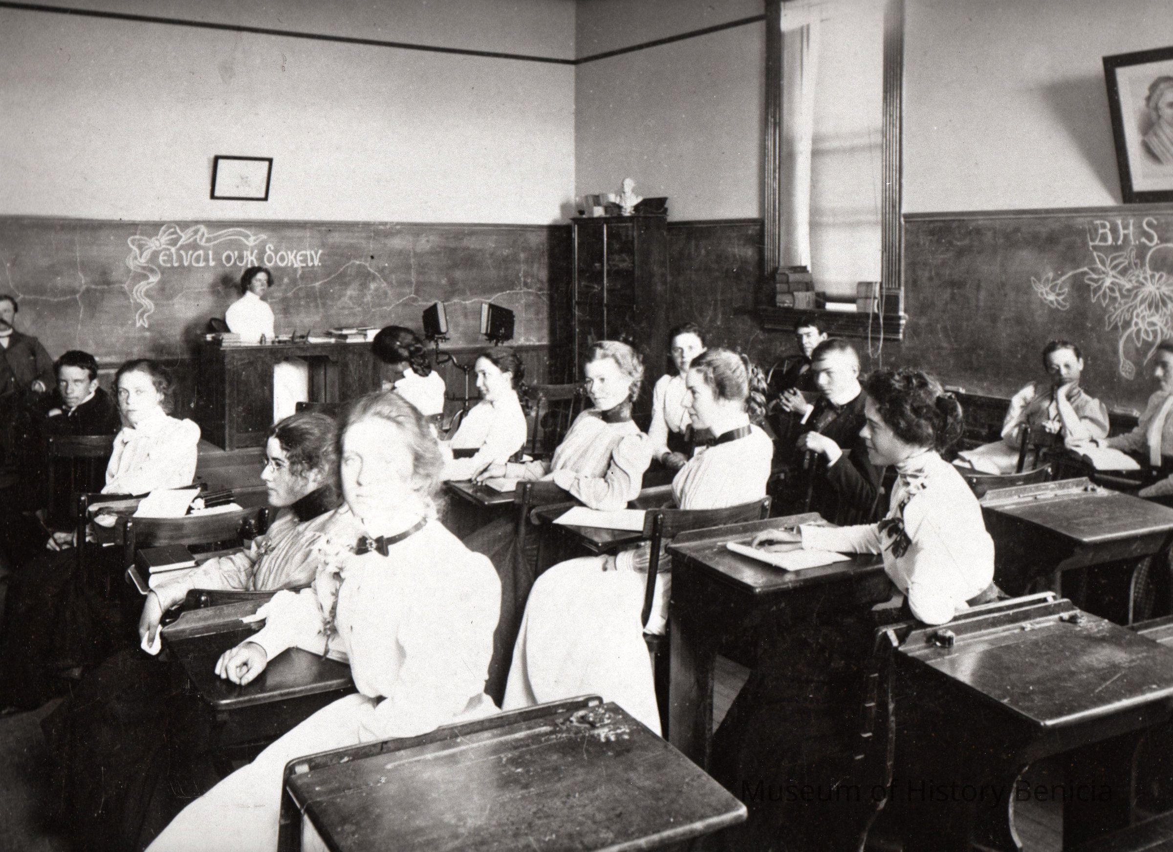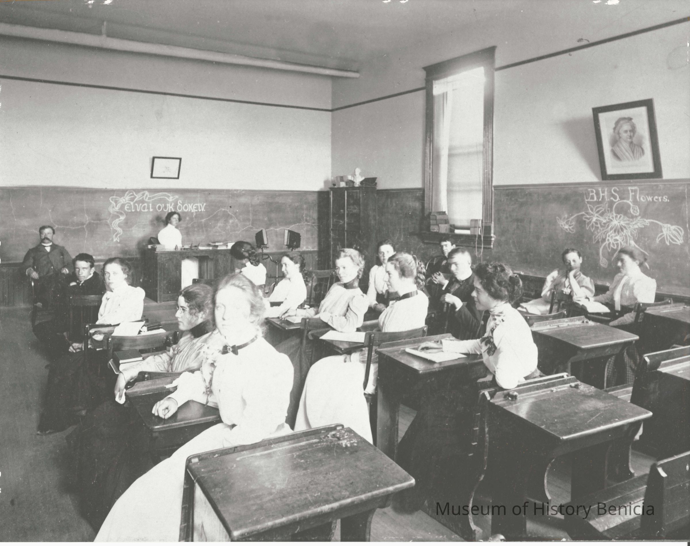B/W photograph of the inside of Benicia High School classroom. Students are sitting at their desks. There are two adults (a man and woman) at the front of the class. Clara Virginia Rauhut Snyder is identified as the girl in the third row from the left in the first seat looking at the camera.