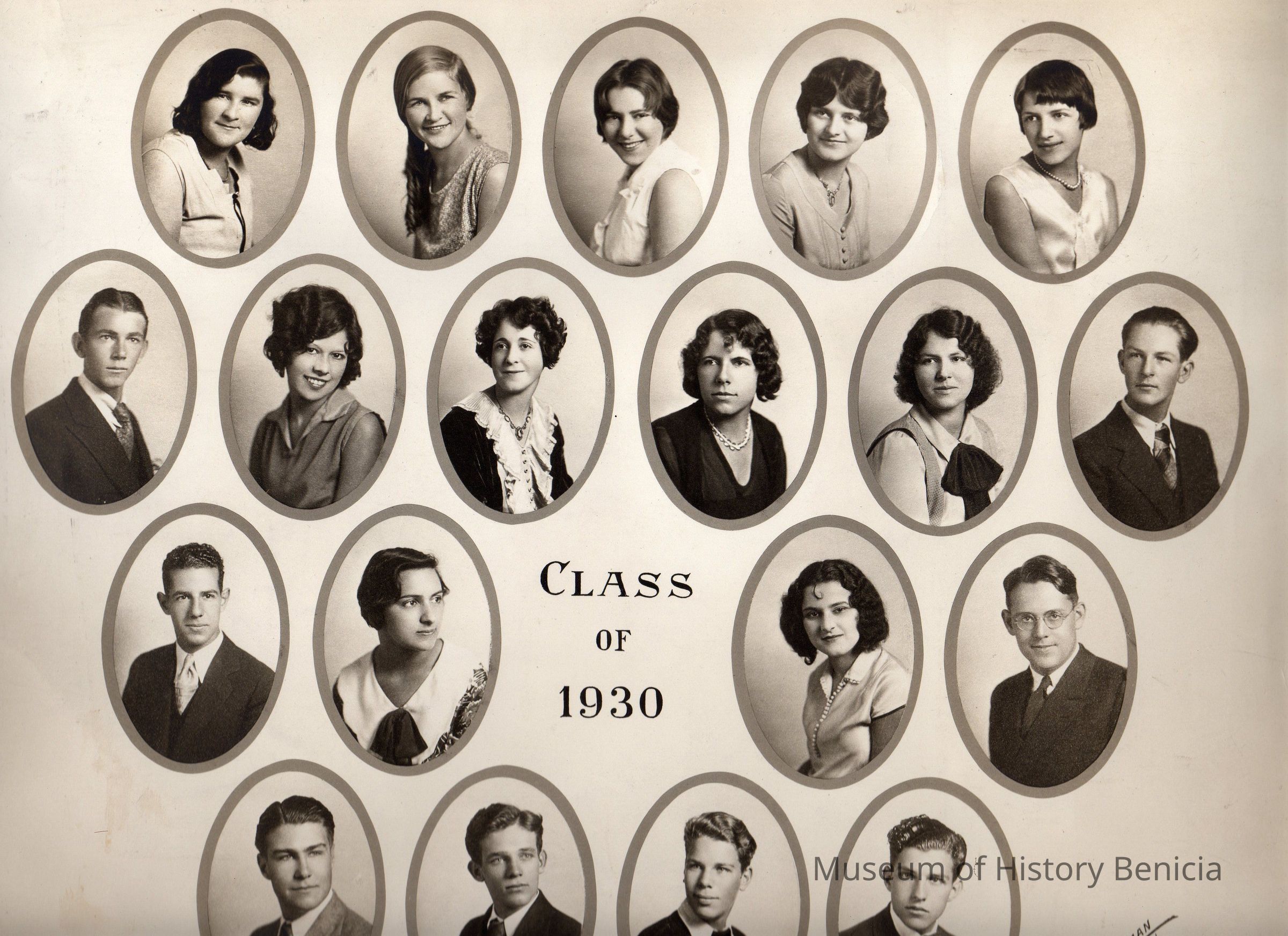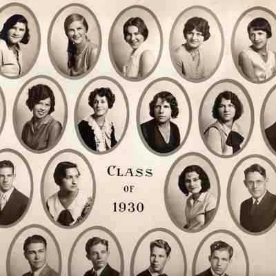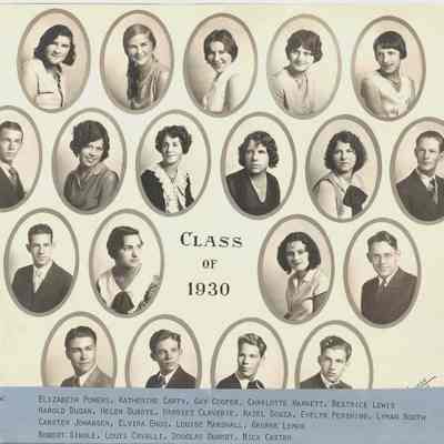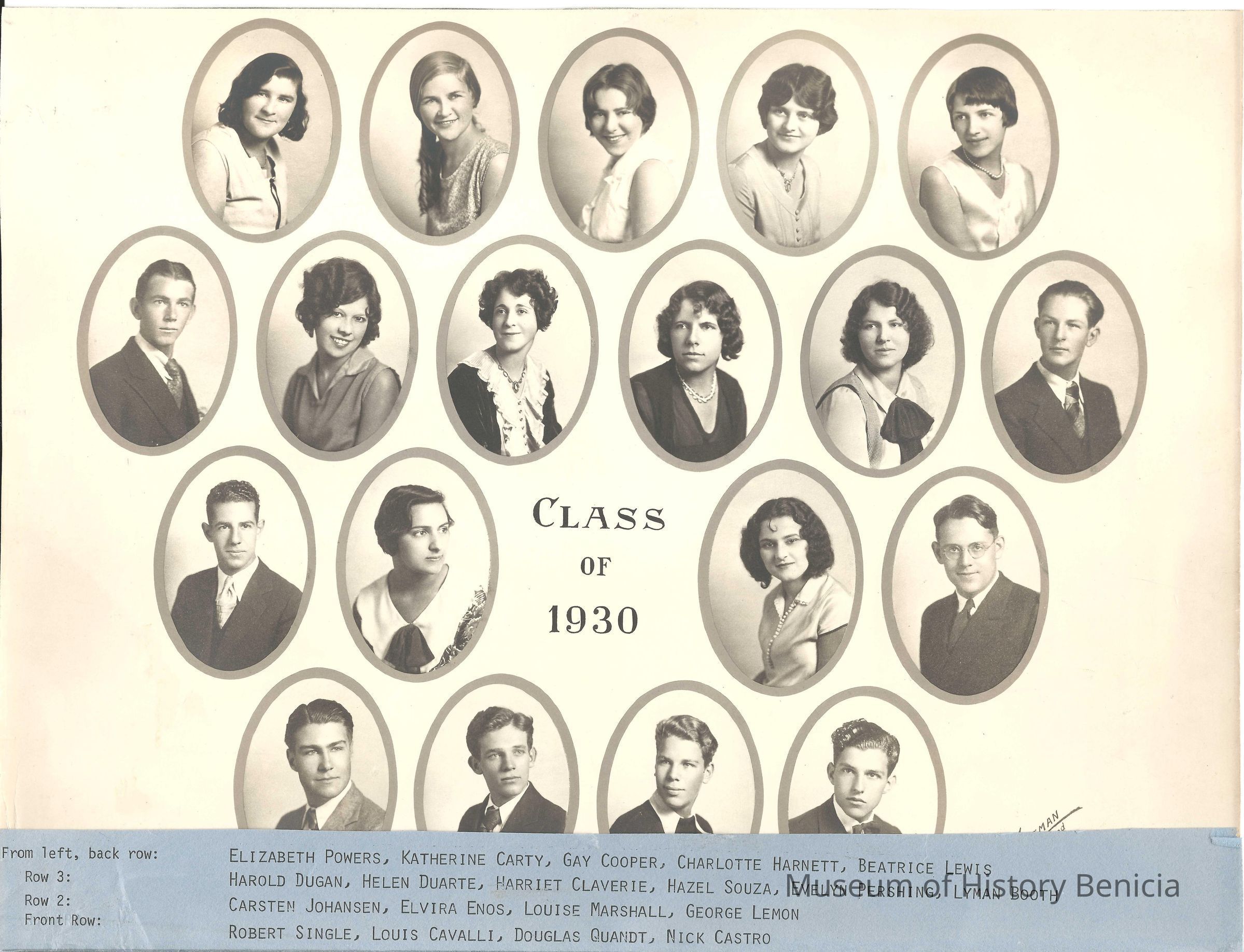 B/W photograph of Benicia High School class of 1930. Beginning on the left, Back Row (or top row): Elizabeth Powers, Katherine Carty, Gay Cooper, Charlotte Harnett, Beatrice Lewis. Row 3: Harold Dugan, Helen Duarte, Harriet Claverie, Hazel Souza, Evelyn Pershing, Lyman Booth.