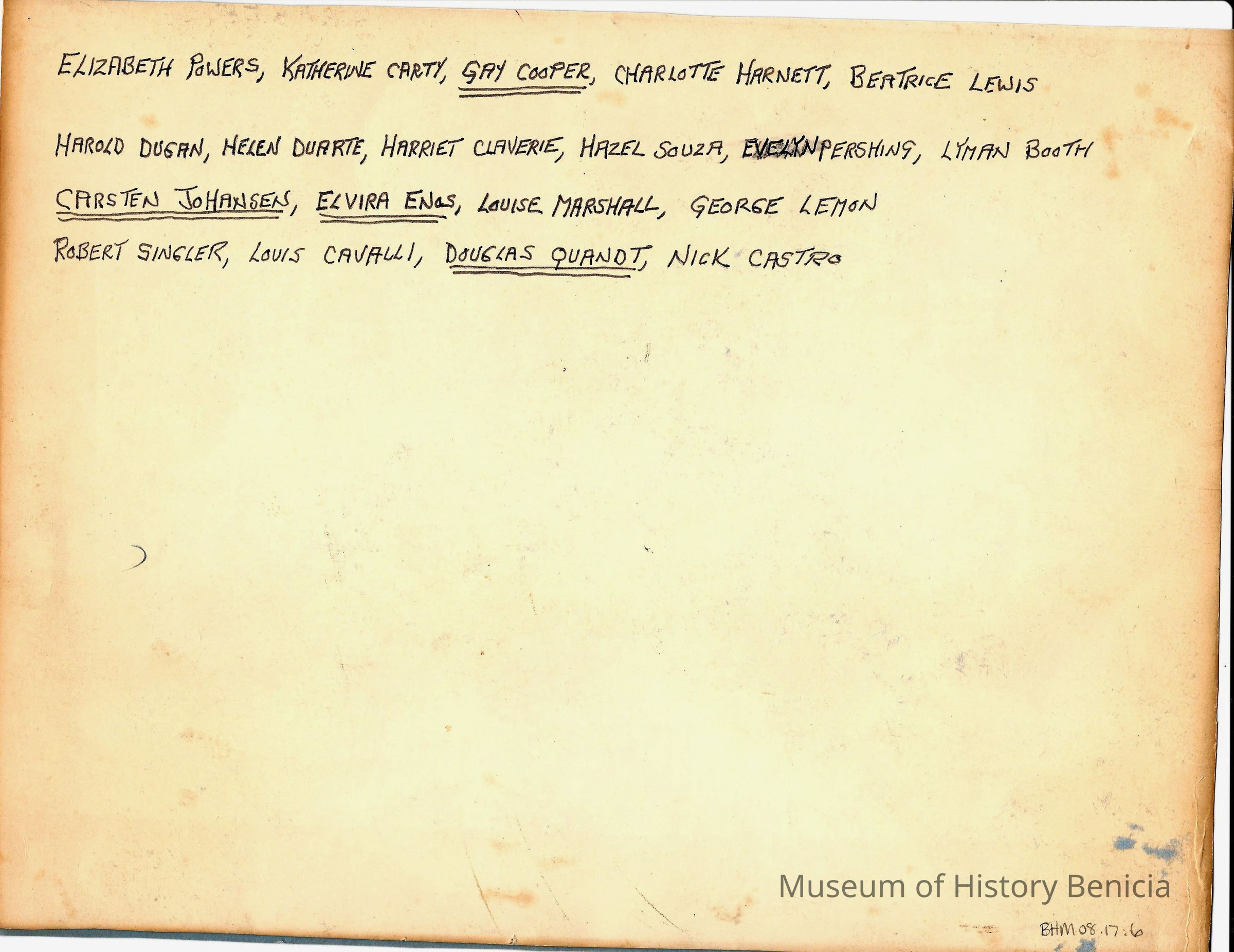 Row 2: Carsten Johansen, Elvira Enos, Louise Marshall, George Lemon. Front Row: Robert Single, Louis Cavalli, Douglas Quandt, Nick Castro.Collection