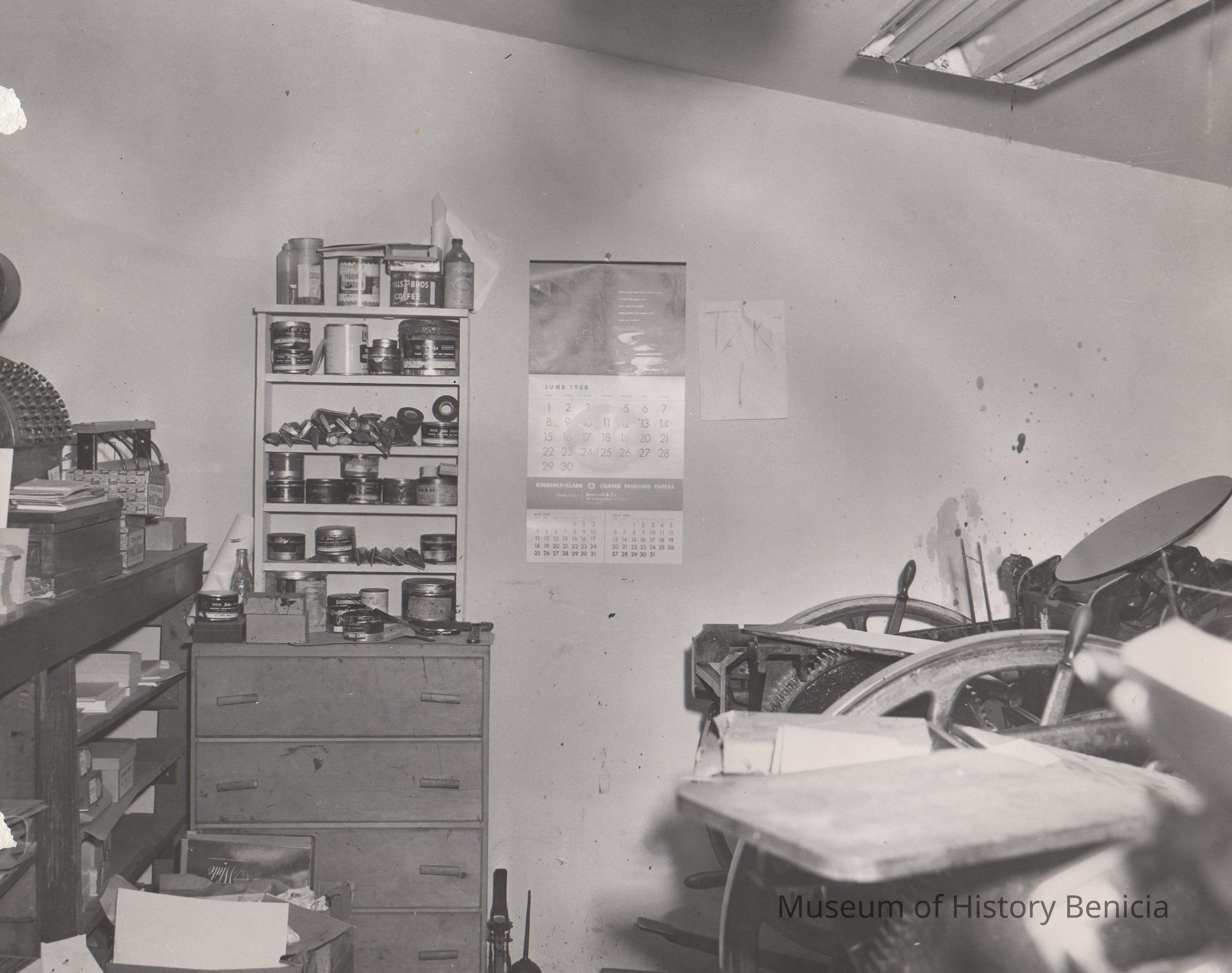 B/W photograph: Shows a corner of the Office of the "The Benician" newspaper. Individual job printing presses are visible, along with various inks and other chemicals used in the printing process in the 1950's.Collection