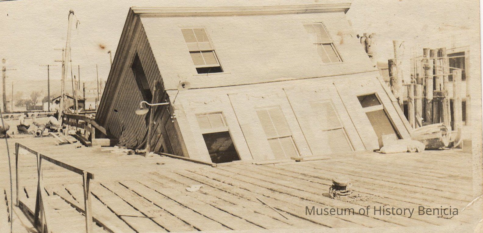 B/W photograph of wharf building collapse. Wood boring insects caused the collapse.