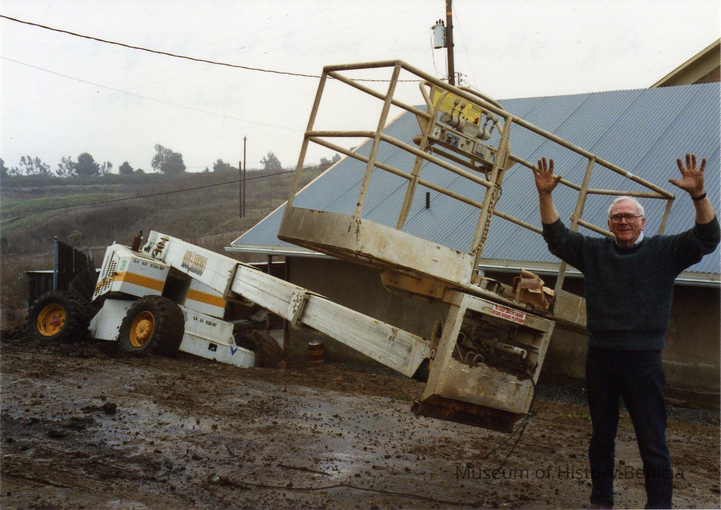 Color photograph of a rig stuck in the mud by Building No. 8 in the Arsenal. Harry Wassmann is standing with arms raised next to the rig.Collection