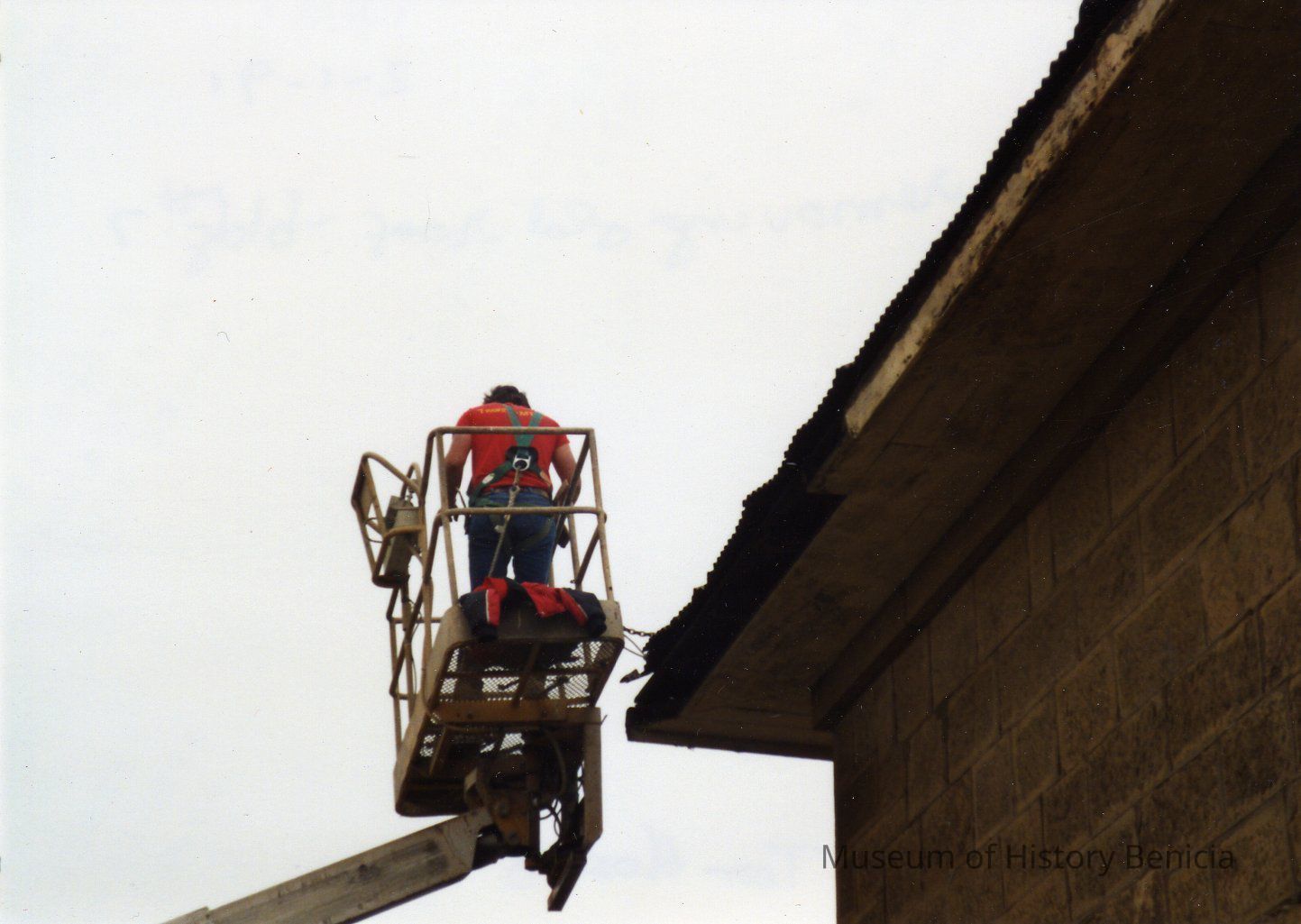 Color photograph of a worker removing old roof of Building No. 7.