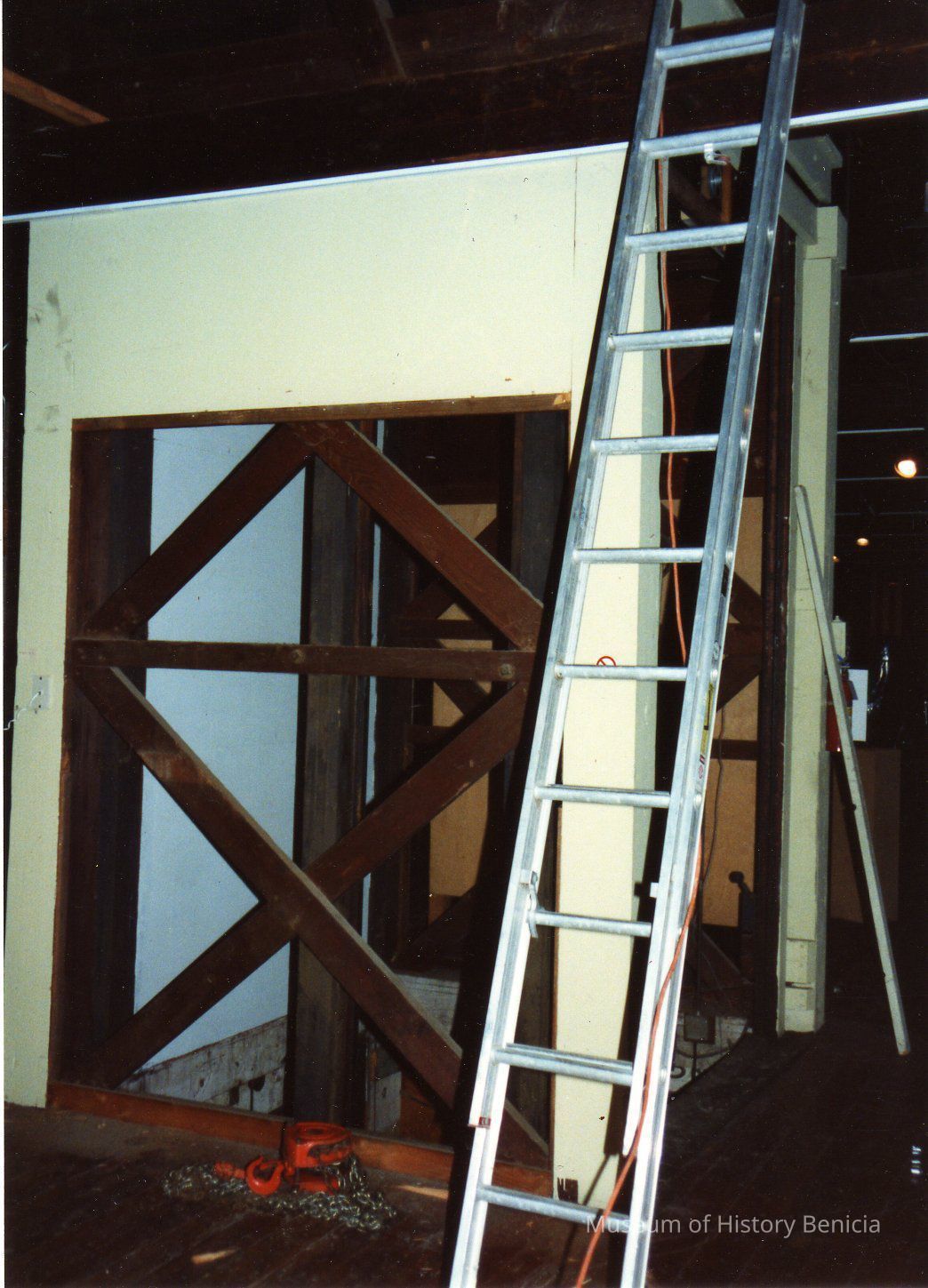 Color photograph of the 1918 elevator shaft being taken down.