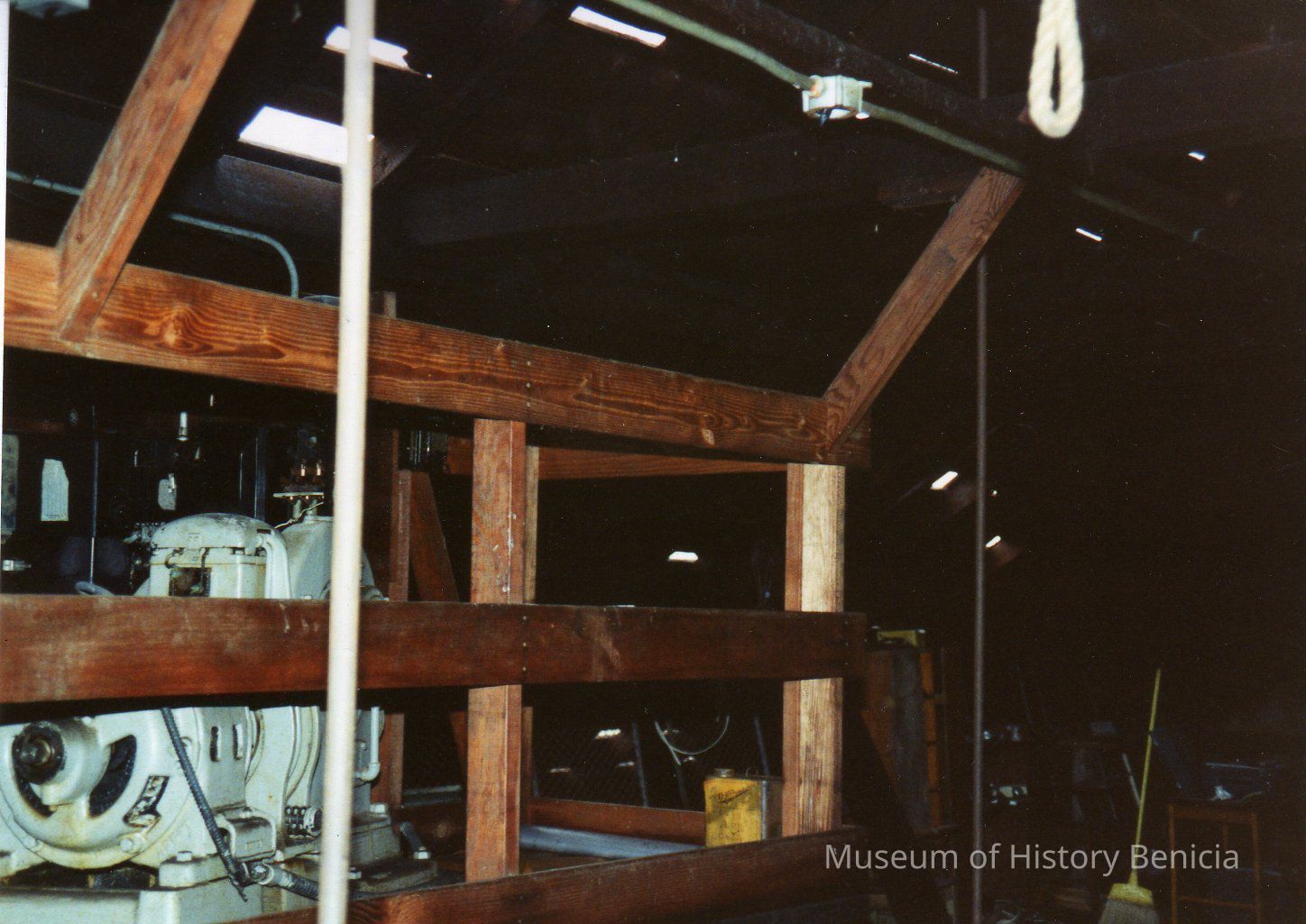 Color photograph of the elevator motor in Building No. 7 and light can be seen shining through where the roof was removed.