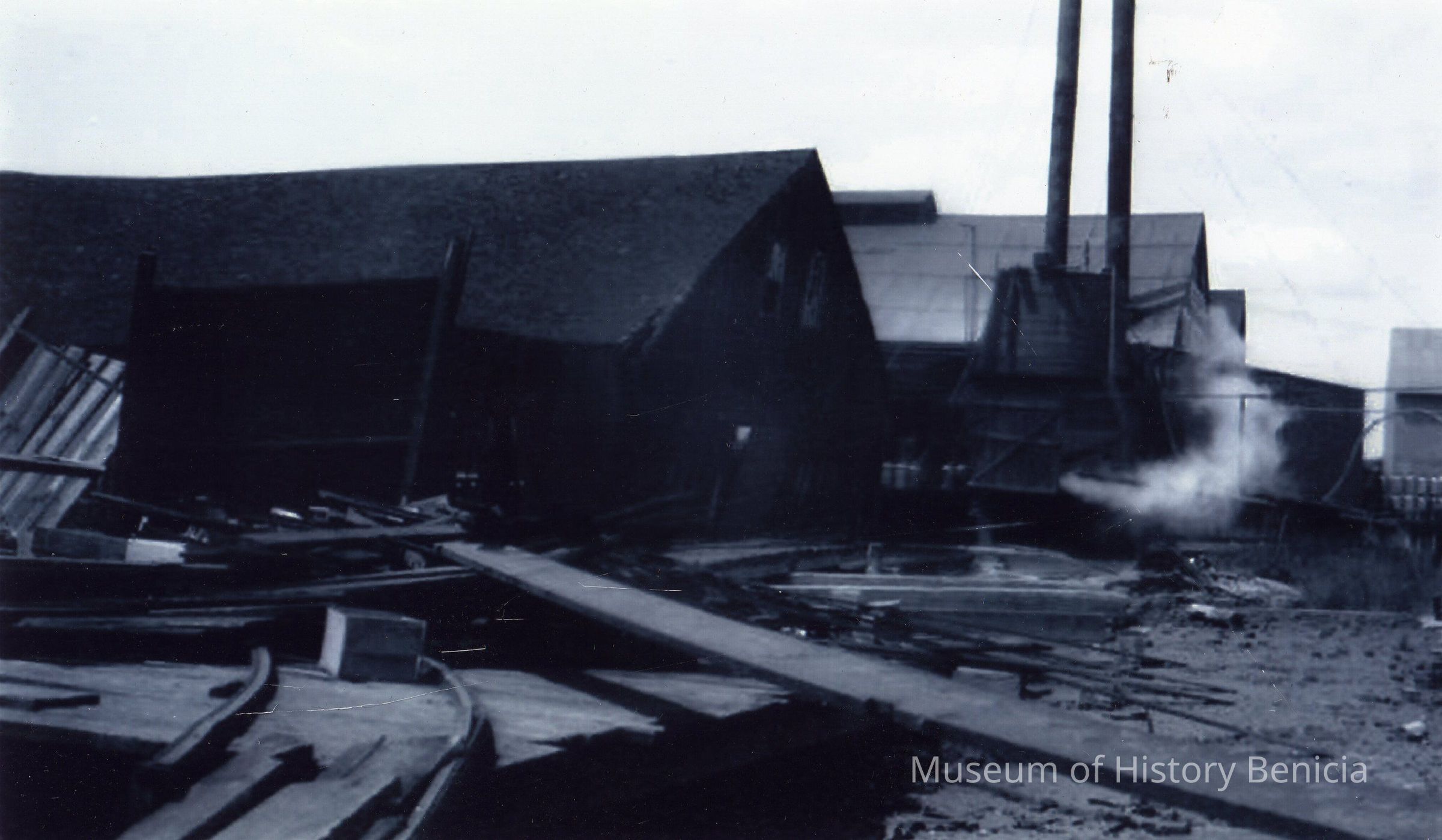 B/W photograph developed from glass plate negative 2004.001.1023. Benicia Wharf collapse