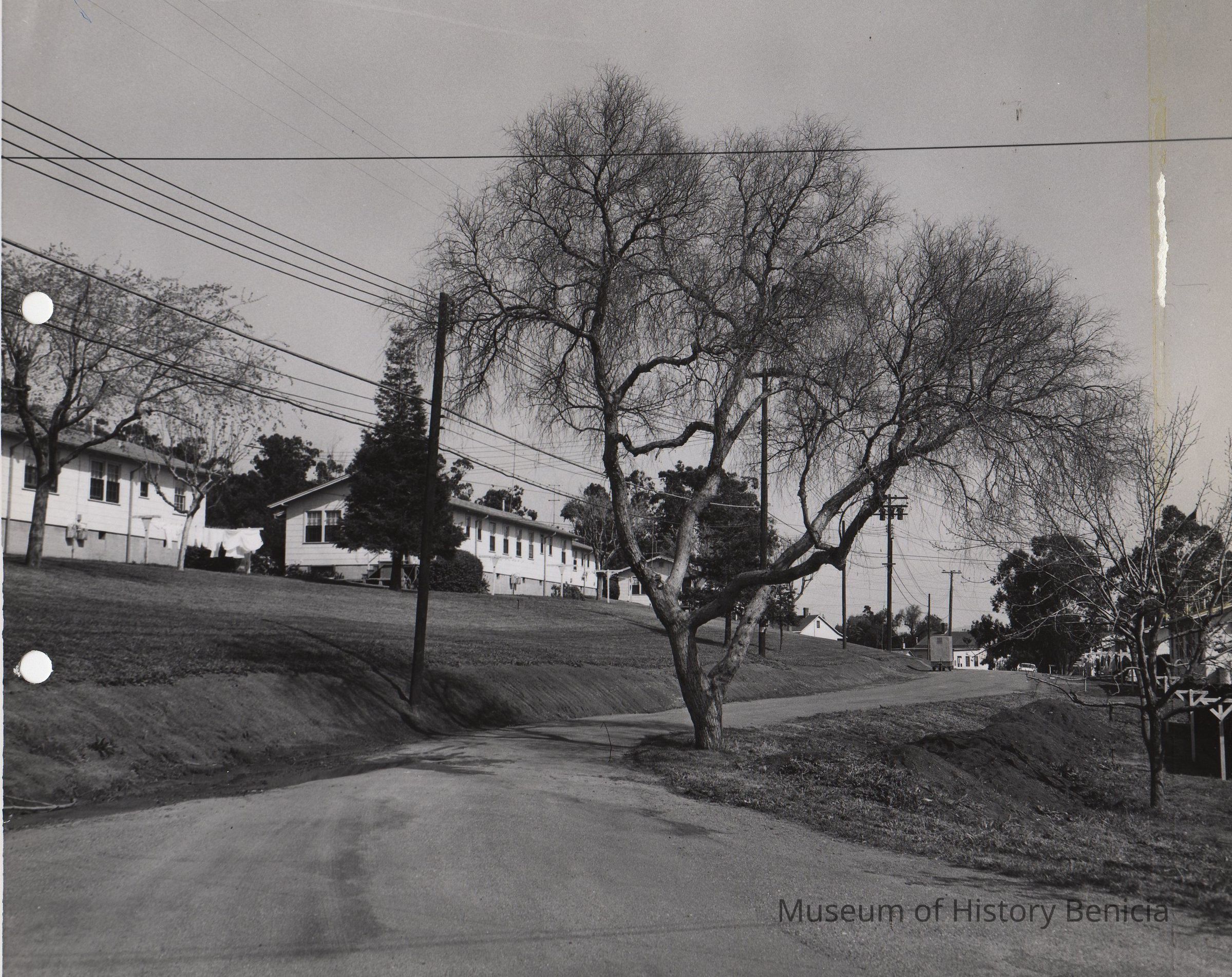B/W Photograph: Housing units just outside the Benicia Arsenal gate, mostly duplex-style